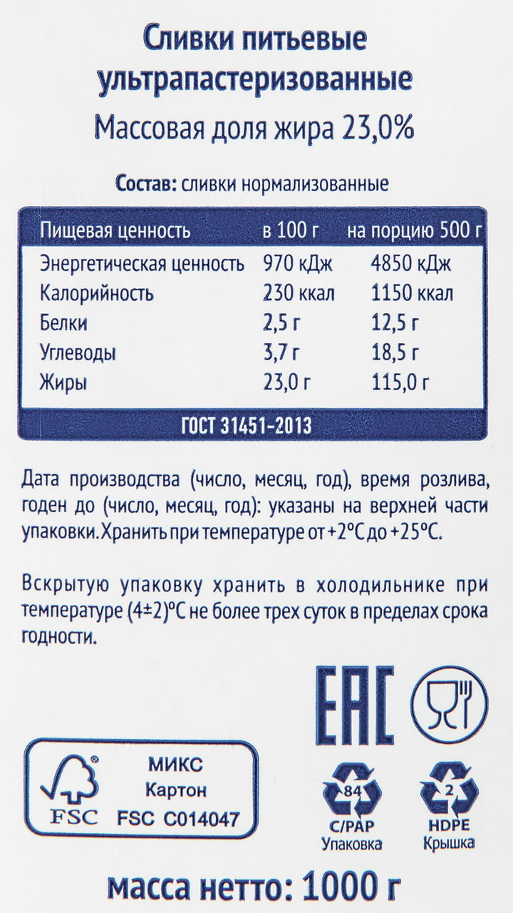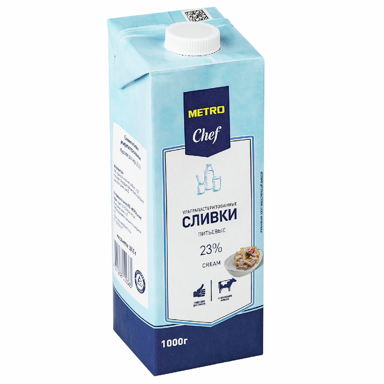 Metro Chef Сливки ультрапастеризованные 23% ТВА 1000г производятся из молока по традиционной технологии без применения консервантов и стабилизаторов. Не рекомендуется использовать для взбивания, так как низкий уровень жирности не позволяет продукту увеличиваться в объеме и держать форму. При добавлении сгущенного молока или джема сливки оседают. Консистенция жидкая, немного гуще молока. В текстуре отсутствуют комочки жиры, цвет однородный, белый. Вкус сладковатый, характерный для сливок. Сливки можно добавлять в какао, кофе, чай, матчу. Также продукт используется при приготовлении мяса, курицы, заливного пирога, киша. На основе сливок можно варить кашу или суп-пюре. На основе сливок можно приготовить холодный освежающий фруктовый коктейль.
