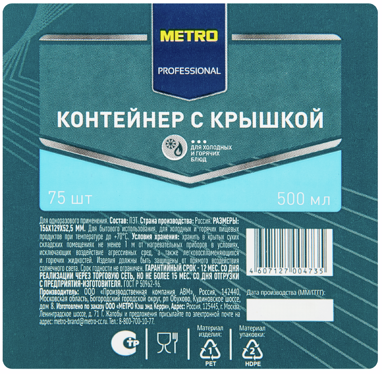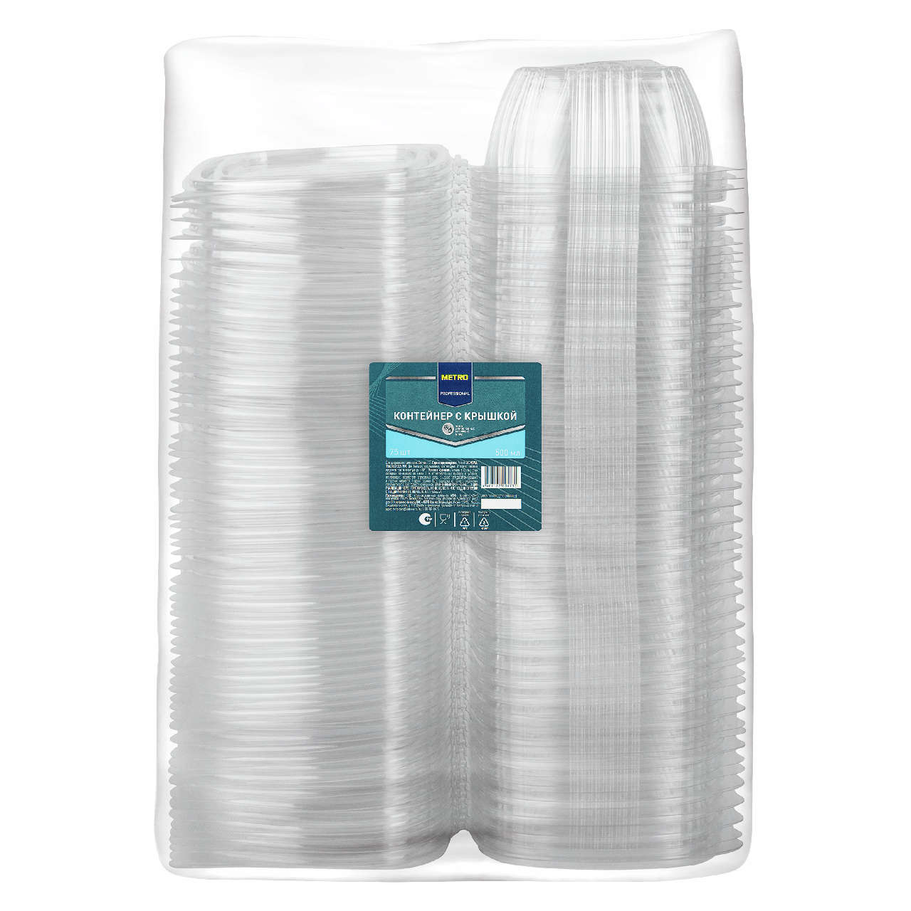 METRO PROFESSIONAL Контейнер одноразовый, 500 мл, 75 шт. — практичная одноразовая посуда для хранения пищевых продуктов. Он создан из плотного материала, устойчивого к механическим повреждениям. Герметично закрывающаяся крышка надежно оберегает содержимое от контакта с окружающей средой, пылью, влажностью, сохраняя вкус и аромат готового блюда. Фиксация осуществляется с помощью клипсовых замков. Материал экологически безопасен, не окисляется и не выделяет вредных веществ при соприкосновении с содержимым. Подходит для использования при высоких и низких температурах. В контейнерах можно реализовывать и хранить готовые салаты, мясные блюда, гарниры, мелкую выпечку, нарезные пироги, полуфабрикаты. Также они подходят для заморозки фруктов, овощей, ягод.