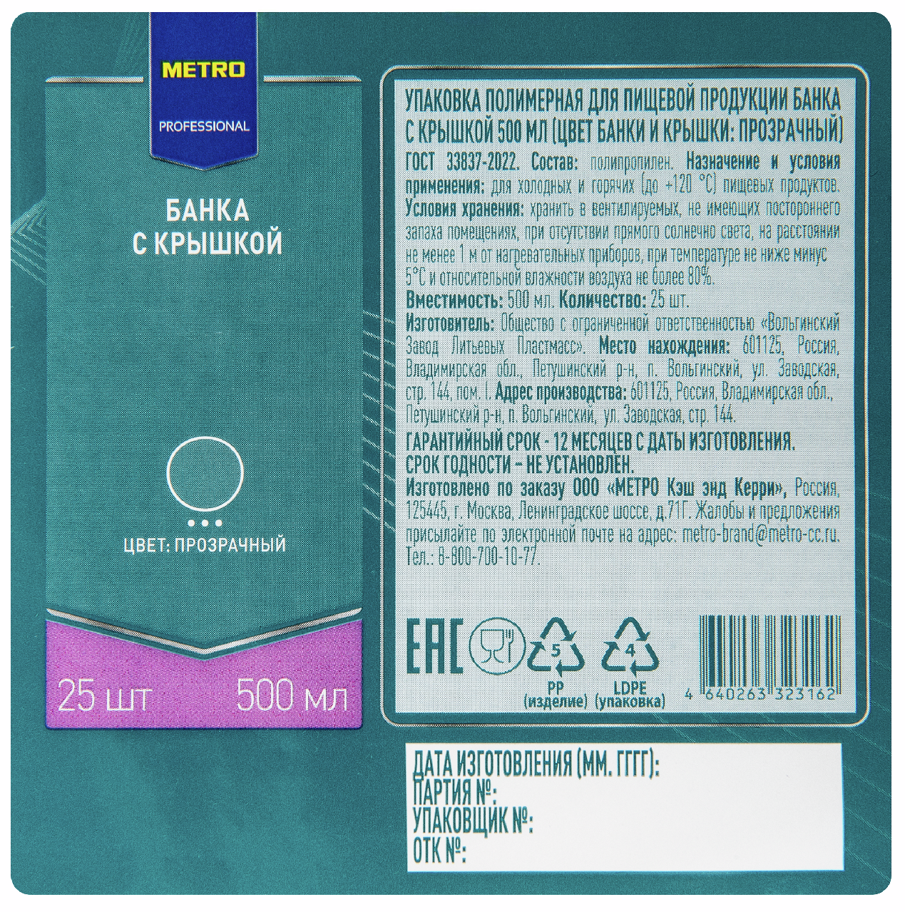 METRO PROFESSIONAL Набор банка с крышкой для пищевых продуктов прозрачная круглая 500мл, 25шт