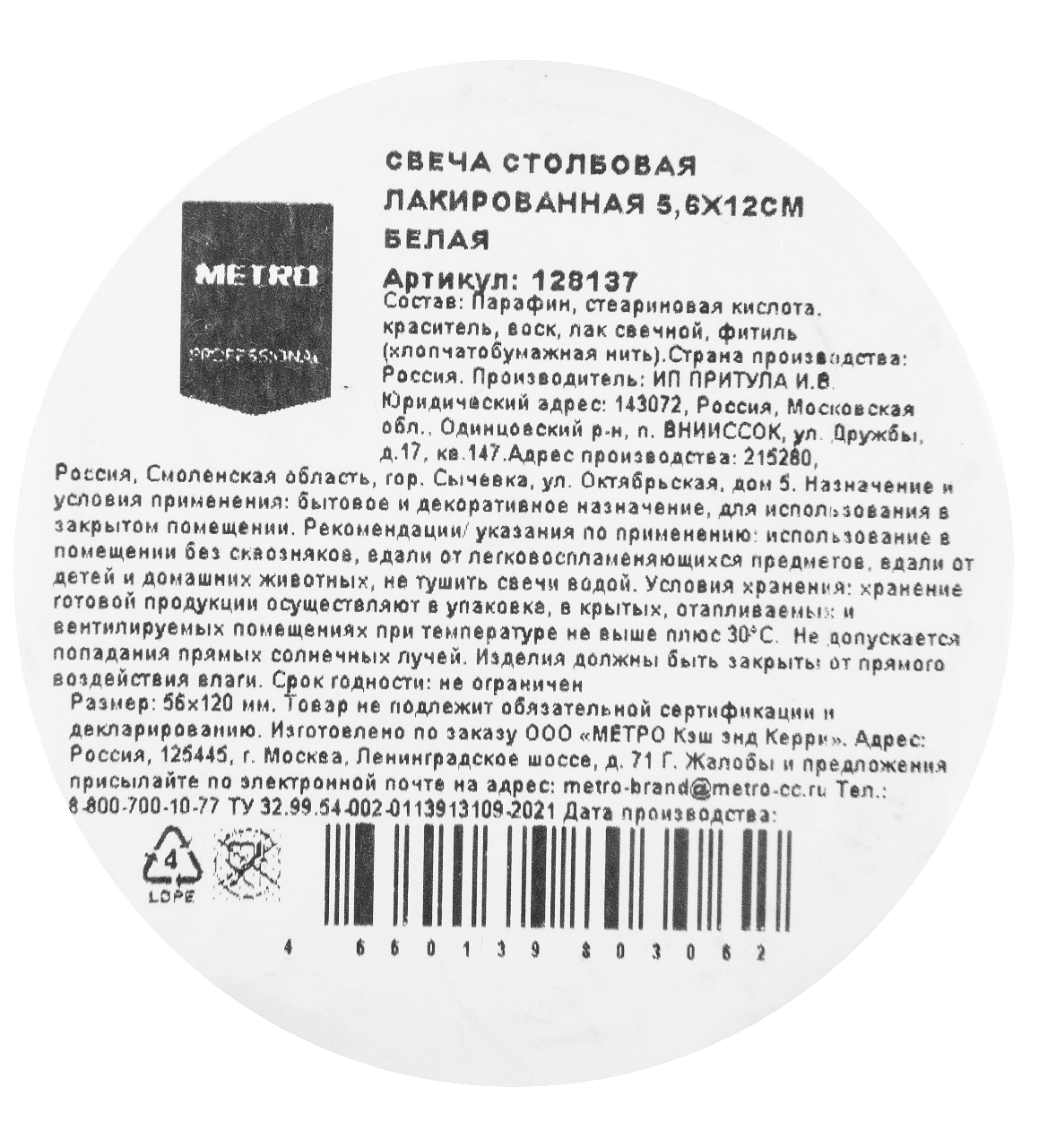 Свеча METRO PROFESSIONAL станет идеальным дополнением для создания волшебного настроения в вашем доме. При изготовлении изделия используются высококачественный парафин, стеариновая кислота и воск. Тщательно подобранные материалы обеспечивают долговечность, предотвращая копчение и треск при горении. Лакированная поверхность придает свече изысканный вид, что делает ее идеальным выбором для любого торжества или повседневного использования. Свеча выполнена в классическом стиле, придавая вашему пространству шарм и элегантность. Независимо от того, украшает ли она ваш стол во время ужина, создает атмосферу на вечеринке или служит центральным элементом декора, этот аксессуар подчеркнет ваш неповторимый стиль. Свеча идеально подходят для использования в доме, ресторане, на вечеринке или в любом месте, где требуется добавить тепла и уюта. Она станет прекрасным дополнением на праздниках, создавая атмосферу радости и праздничного настроения. Рекомендуется хранить изделие в прохладном и темном месте, подальше от прямых солнечных лучей. При необходимости можно протирать лакированную поверхность мягкой сухой тканью для поддержания блеска.
