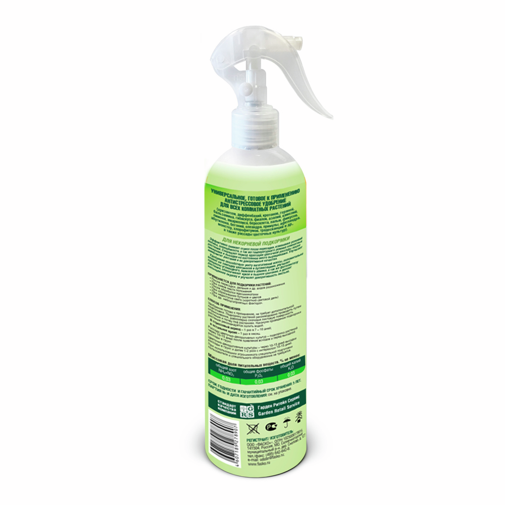 Удобрение Фаско Антистресс минеральное, 405 мл применяется для опрыскивания листьев и корневой системы комнатных растений, таких как: хризантемы, диффенбахии, кротоны, герани, бальзамины, гибискусы, фиалки, азалии, камелии, пальмы, фикусы, бегонии, примулы и другие, а также для рассады цветочных культур. Эффективно снимает стресс после пересадки, изменения условий полива освещенности, а также температурного режима. Сокращает период адаптации цветочной рассады после пикировки и высадки на постоянное место выращивания. Повышает иммунитет растений и улучшает их декоративные качества.