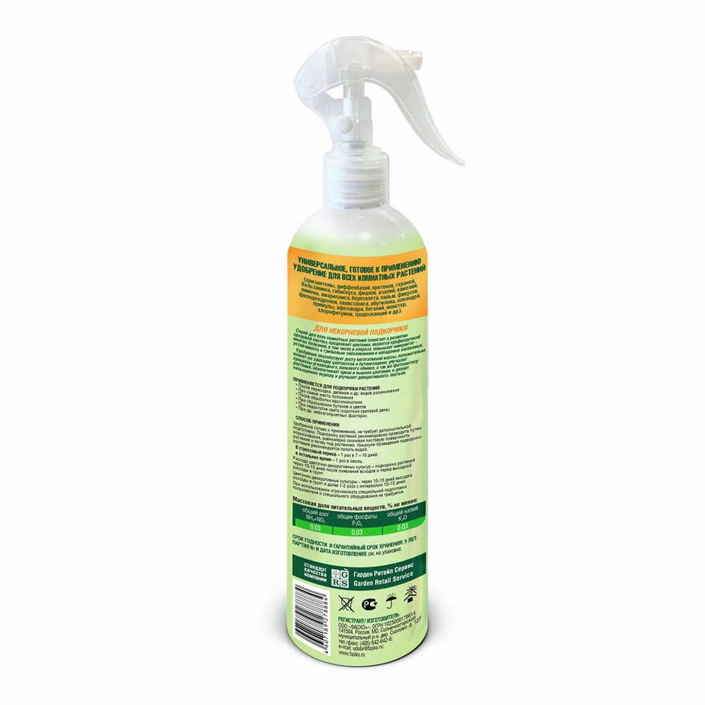 Удобрение для комнатных растений Фаско минеральное, 405 мл – полностью готовое к применению удобрение для внекорневой подкормки. Применяется для опрыскивания листьев и корневой системы комнатных растений, таких как: хризантемы, диффенбахии, кротоны, герани, бальзамины, гибискусы, фиалки, азалии, камелии, пальмы, фикусы, бегонии, примулы и другие. Спрей для всех комнатных растений помогает в развитии здоровой листвы, продлевает цветение, является профилактикой многих болезней, в том числе и хлороза, повышает иммунитет – устойчивость к грибковым заболеваниям и нападению насекомых.