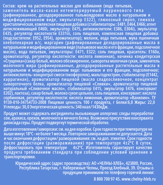 Крем на растительных маслах для взбивания (вода питьевая, заменитель масла-какао нетемперируемый лауринового типа (рафинированное, дезодорированное пальмоядровое масло в натуральном и модифицированном виде, эмульгатор E322), глюкозный сироп, глюкоза кристаллическая, комплексная пищевая добавка (стабилизаторы: E481, E464, E466, агент антислеживающий E460i, эмульгатор: E475, антиокислители: E386, E304i), эмульгатор E435, регулятор кислотности E331iii, соль пищевая, комплексная пищевая добавка (подсластители: E952, E954), ароматизатор), меланж, вода питьевая, мука пшеничная хлебопекарная в/с, маргарин (рафинированные дезодорированные масла в натуральном и модифицированном виде (пальмовое масло и его фракции, подсолнечное масло), вода питьевая, эмульгаторы: E471, E322, соль пищевая, краситель: E160а, ароматизатор, регулятор кислотности: кислота лимонная), начинка кондитерская Сгущенка (сахар белый, молоко обезжиренное, сыворотка молочная сухая, заменитель молочного жира (рафинированные, дезодорированные растительные масла в натуральном и модифицированном виде: пальмовое и его фракции, подсолнечное, антиокислитель - концентрат смеси токоферолов), мальтодекстрин, стабилизатор (E1442, каррагинан), ароматизатор пищевой (масло сладкосливочное, концентрат сывороточного белка, ароматизатор пищевой Сливки, ароматизатор пищевой натуральный Сливочное масло, стабилизатор E415, эмульгатор E476, консервант (E202), лактоза), сахар белый, молоко сухое цельное, соль пищевая, консервант: кислота сорбиновая, регулятор кислотности: кислота лимонная, ароматизатор Ванилин.