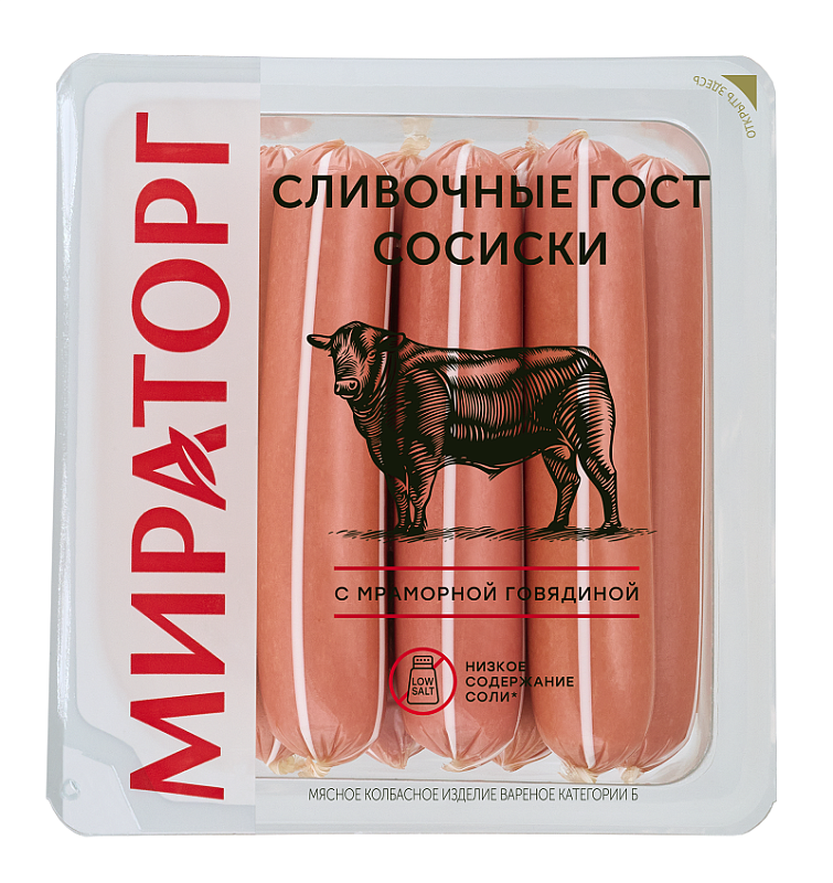 Сосиски Мираторг Сливочные, 400г – сытный продукт с высокой энергетической ценностью, идеально подходящий для быстрого перекуса и приготовления ряда блюд. Для производства используется свиная лопатка и топсайд из говядины. Благодаря этому колбасное изделие характеризуется богатым химическим составом – в нем есть ряд витаминов (в частности, группы B) и минеральных веществ (калий, кальций, магний, фосфор, натрий и др.). Для приготовления мясного фарша в него добавляются также сухие сливки. Сочная структура сверху покрыта более плотной корочкой. Продукт готов к употреблению. Из него можно сделать вкусные и сытные бутерброды. Также сосиски хорошо сочетаются с разнообразными гарнирами, например, гречкой, рисом, картошкой, и соусами. Помимо этого, их до��авляют в выпечку и пиццу.