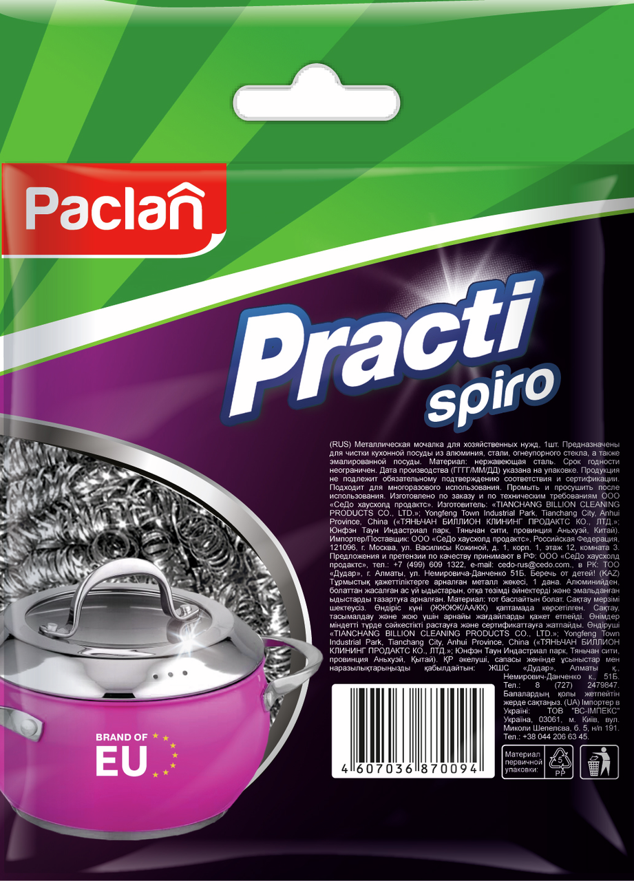 Мочалка Paclan Practi Spiro металлическая, 12,5 x 9,3 x 3,3 см сплетена из единой нити в форме больших непрерывных колец и скручена в виде клубка. Мочалка не деформируется, не разваливается и не разламывается, без острых зазубренных концов, не царапает стеклянные поверхности и не цепляется за решетку мойки и столовые приборы. Легко удаляет засохшие и пригоревшие остатки пищи, эффективно справляется со следами грязи, пятнами и ржавчиной. Мочалку приятно держать в руках благодаря мягкой структуре и удобно пользоваться. Легко промывается водой и не приобретает неприятного запаха. Спиралевидная структура мочалки способствует обильному пенообразованию и эффективно очищает посуду.