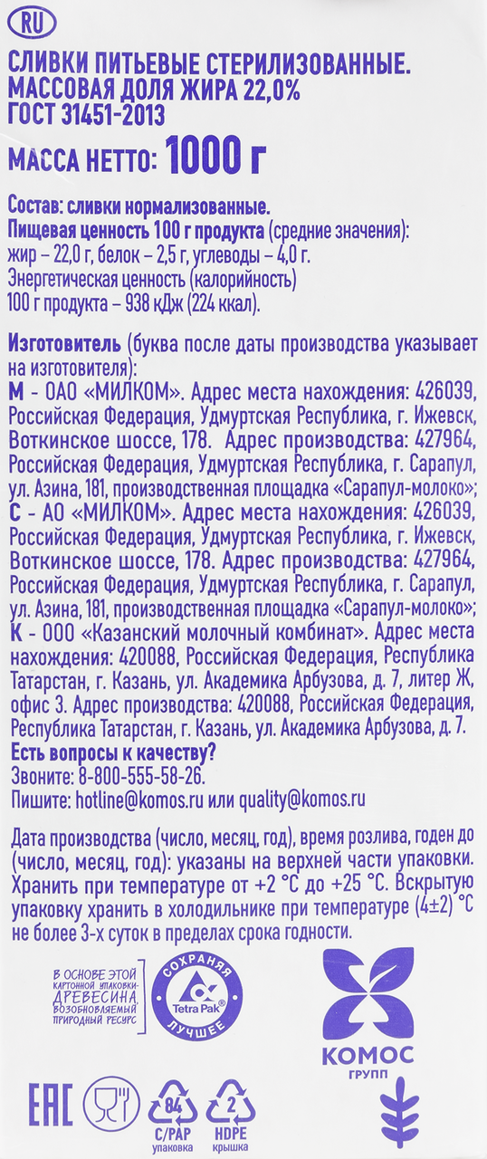 Сливки Молочная речка 22%, 1кг БЗМЖ (без заменителя молочного жира) относится к питьевому, можно добавлять в кофе. Однако этот продукт чаще используется на профессиональной кухне. Его применяют кондитеры для приготовления сливочных кремов с добавлением джемов, шоколада, сгущенного молока, которые потом используются для наполнения: тортов, бисквитов, кексов, пончиков. Опытные повара на основе сливок готовят не т��лько суфле, крема, мороженое, но и горячие блюда, соусы. Взбитыми сливками можно украсить кофе. Продукт натуральный, в составе не содержит ГМО, крахмала и загустителей. Сливки однородные, достаточно вязкие, легко взбиваются и долгое время не оседают, сохраняют структуру. Консистенция гладкая, отсутствуют сбившиеся комочки жира.