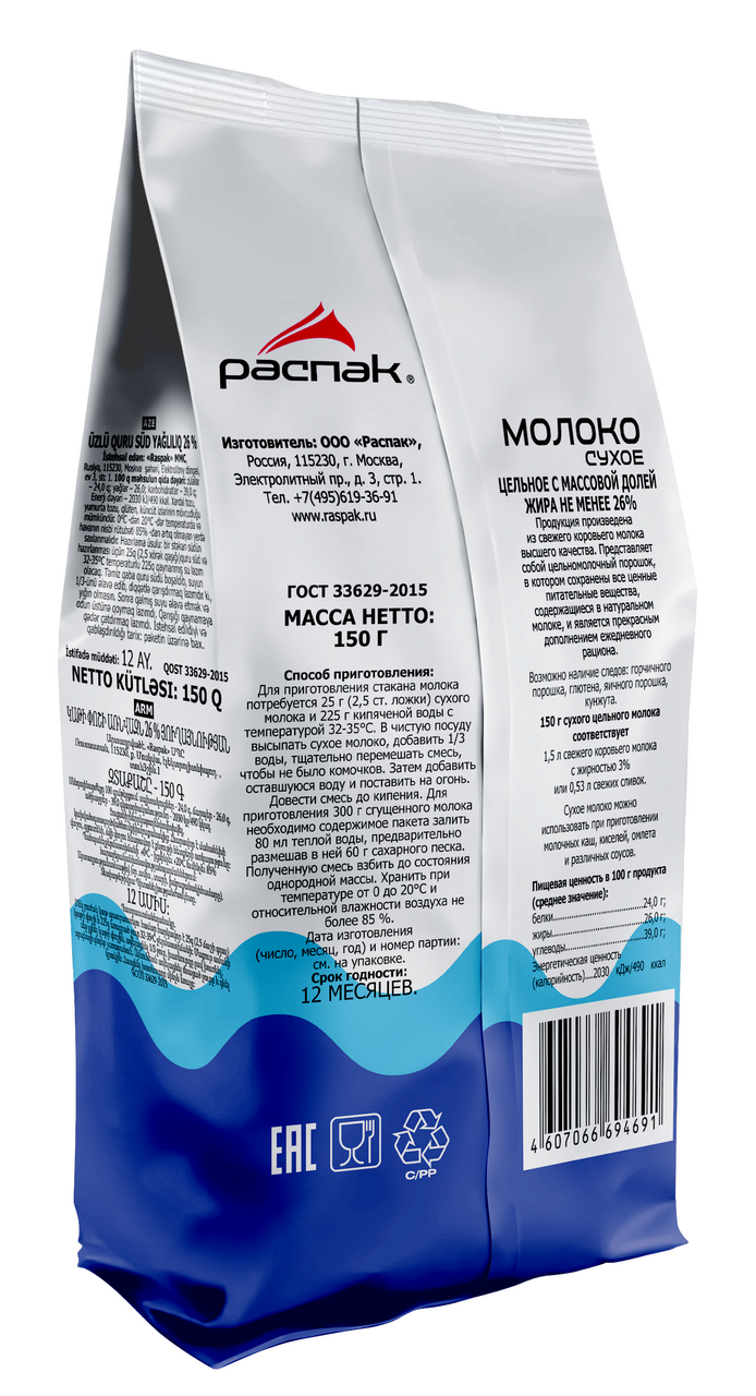 Молоко Распак Цельное сухое ГОСТ 26%, 150г