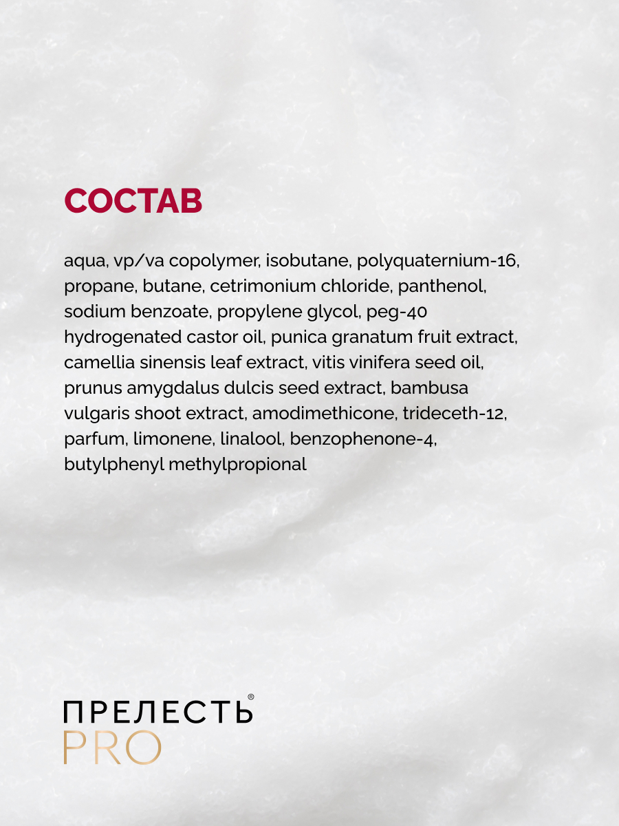 Мусс сверхсильной фиксации с эффектом памяти Прелесть Pro - это идеальное средство для укладки, которое подарит вашим волосам упругую фиксацию без склеивания до 24 часов. Стайлинг обладает особой технологией запоминания формы прически и восстанавливает ее даже после деформации, сна или ношения головного убора. В составе профессионального средства содержится уникальный комплекс витаминов, минералов и масел 5 Pro Complex, компоненты которого восстанавливают структуру прядей изнутри, защищают от внешних факторов и предотвращают механические повреждения, пересушивание, воздействие УФ-излучения. Пенка не только обеспечивает сильную фиксацию, но и гарантирует, что ваши волосы будут выглядеть так, как вы задумали, на протяжении всего дня. Средство легко наносится, быстро высыхает, не оставляет неприятной липкости и легко вычесывается. Оно не имеет запаха и отдушек не перебивает парфюм, легко вычесывается или смывается шампунем.
