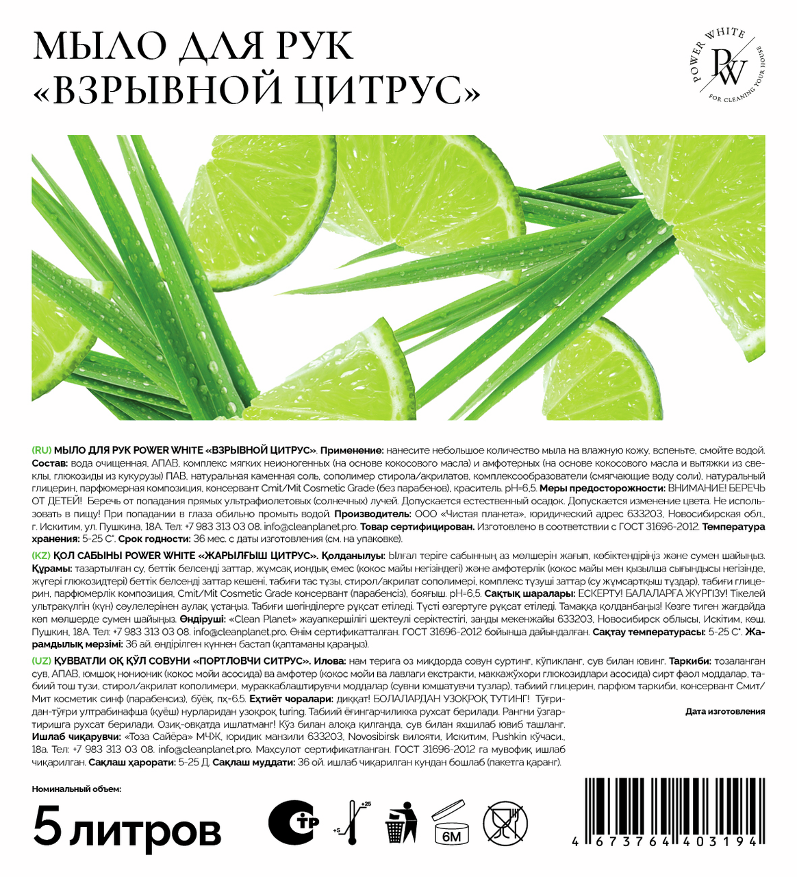 Мыло жидкое Power White Взрывной цитрус, 5л