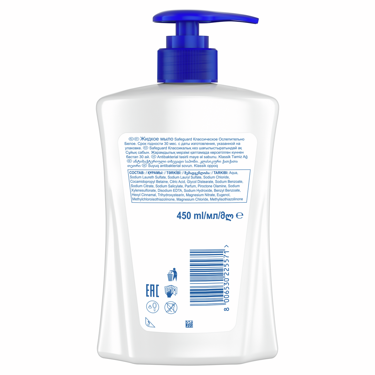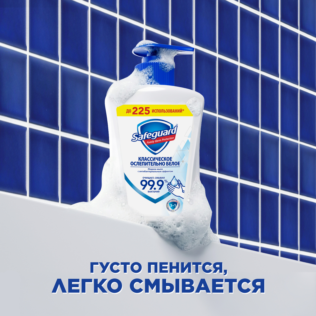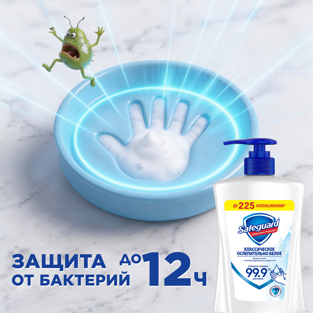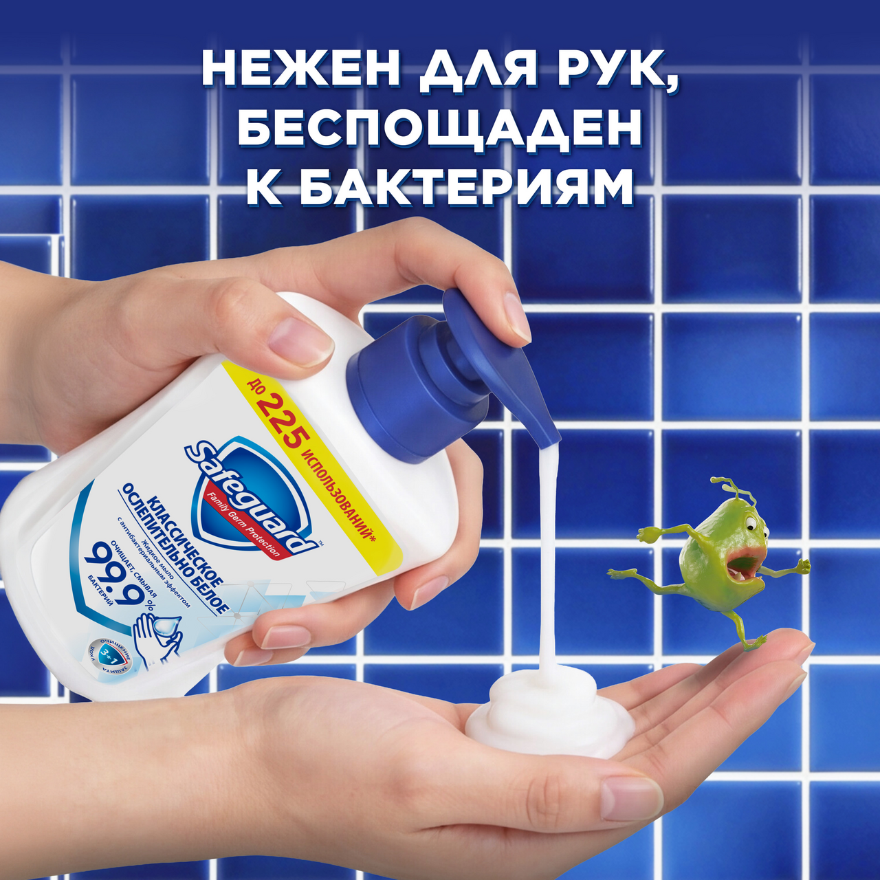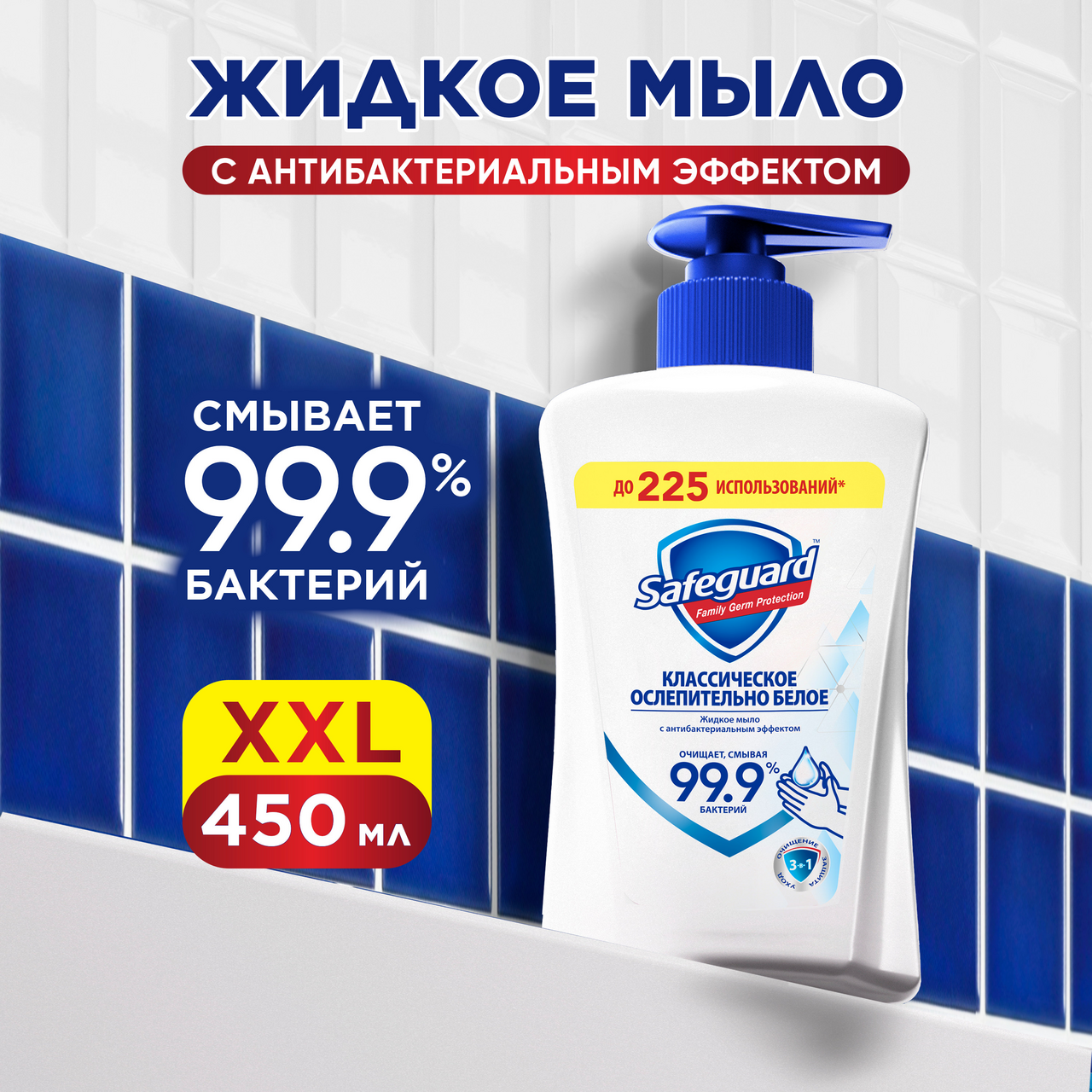 Позаботьтесь о здоровье своей семьи и детей, выбрав защиту и бережный уход от Safeguard (Сейфгард) с антибактериальным эффектом. Обновленная формула жидкого мыла смывает 99.9% бактерий, и обеспечивает защиту от микробов до 12ч - даже после мытья рук. Наше мыло нежно для кожи, беспощадно к бактериям. Попробуйте выгодную упаковку жидкого мыла 450мл - до 225 использований, с заботой о ваших близких.По данным Всемирной организации здравоохранения, тщательное мытье рук - наиболее эффективный метод предотвращения распространения вирусов. Способ применения: выдавите порцию мыла на руки, намыльте ладони, обработайте тыльную поверхность, зоны между пальцами и под ногтями, ополосните руки водой и высушите полотенцем. Рекомендуемая продолжительность мытья рук - 40-60 секунд.