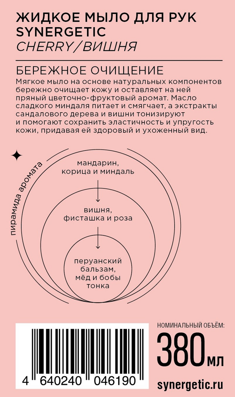 Жидкое мыло для рук Synergetic cherry/вишня бережно очищает кожу и оставляет на ней пряный цветочно-фруктовый аромат. Уникальный комплекс натуральных компонентов обеспечивает длительный смягчающий эффект и способствует восстановлению липидного слоя кожи. Масло сладкого миндаля питает и смягчает, насыщает кожу витаминами и полезными элементами. Экстракт сандалового дерева тонизирует и помогает сохранить эластичность и упругость кожи, придавая ей здоровый и ухоженный вид. Экстракт вишни интенсивно увлажняет кожу, поддерживая гидролипидный баланс и её естественные барьерные функции, помогает коже справляться с негативными воздействиями окружающей среды. Мультифункциональный компонент натурального происхождения софоролипид мягко очищает и сохраняет естественный микробиом кожи. Смелая и насыщенная парфюмерная композиция открывается сочными нотами спелой и сладкой вишни, звучание которой чувствуется с первых аккордов в обрамлении терпкой корицы и горького миндаля вплоть до заключительных шлейфовых тонов. Сочетание сладких фруктовых и пряных амбровых оттенков создаёт неповторимый и соблазнительный букет аромата. Завершает композицию богатая симфония чувственных нот перуанского бальзама, обжаренных бобов тонка, тёплых ванильных, карамельных и медовых тонов, которые окутывают и согревают, пробуждают чувственность и будоражат фантазию.