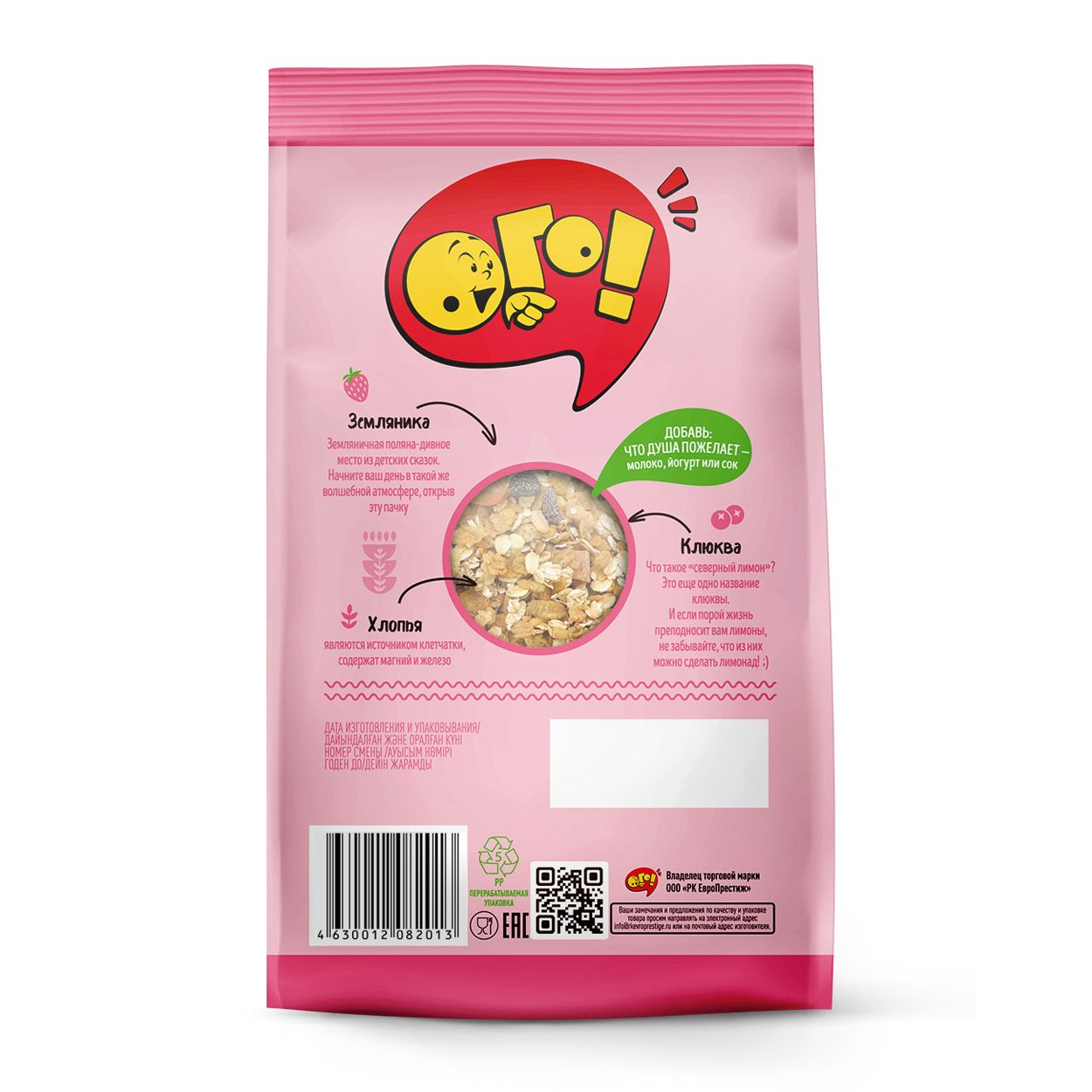 Сбалансированных и полезных готовых завтраков ОГО! Овсяные и пшеничные хлопья в составе наполнят организм энергией, сублимированная земляника и клюква подарят бодрое настроение и яркий вкус. Благодаря бережной обработке зерен, в них сохраняется максимум полезных веществ: пищевые волокна, необходимые для правильной работы ЖКТ, витамины группы В и РР, а также магний, кальций, цинк и железо. А сублимированные ягоды - это не только вкусный, но и полезный ингредиент, который содержит множество важных витаминов и минералов, таких как витамин С, калий, магний и антиоксиданты. Добавьте к порции мюсли теплое молоко или йогурт и сытный, натуральный завтрак готов.