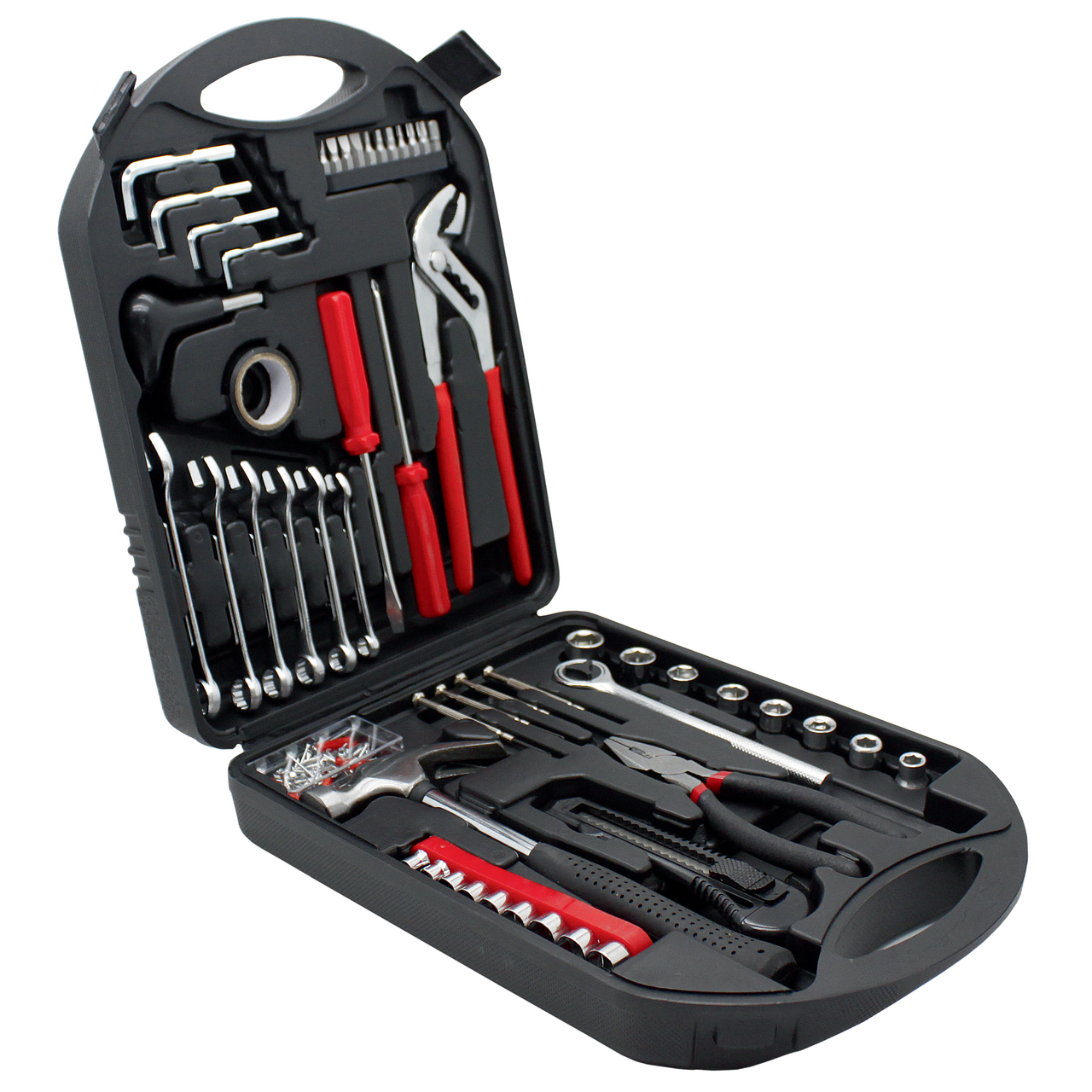Предназначен для обслуживания легковых и грузовых автомобилей, а также для проведения ремонта бытовых конструкций и садовой техники дома и на даче. Инструменты изготовлены из высокопрочной углеродистой стали, благодаря чему достигается их высокая прочность и износостойкость. Кейс выполнен из твердого пластика с замками. Комплектация набора (141 предмет): Нож строительный c выдвижным лезвием. Пассатижи комбинированные 150мм. Переставные пассатижи на шарнире с проточкой 225мм. Молоток-гвоздодер цельнометаллический. Изоляционная лента, черная. Ключи комбинированные рожково-накидные: 8-10-11-12-13-14мм. Шлицевая отвертка 6*4. Крестовая отвертка 6*4. Вороток реверсивный 3/8. Торцевые головки 3/8 – 10-11-12-13-14-15-17-19мм. Торцевые головки 1/4 – 5-6-7-8-9-10-11-12-13мм. Шестигранные ключи, 4шт.: 3-4-5-6мм. Набор бит, 11шт. Отвертка-вороток для съемных бит. Прецизионные отвертки, шлиц 2.0,2.4/крест 2.0,2.4. Крепежные изделия 89шт.
