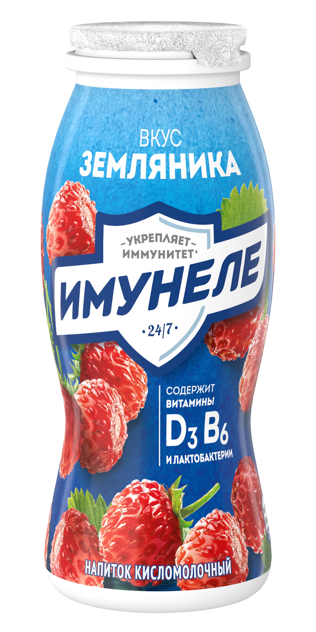 Напиток кисломолочный Имунеле вкус Земляника 1,2% 6*100 г. Состав: А - молоко нормализованное, сахар, вода, глюкозно-фруктозный сироп, концентрированный яблочный сок, концентрированный сок из земляники садовой, концентрированное пюре из земляники садовой, стабилизатор - пектин, ароматизаторы, витаминно-минеральный премикс, краситель - кармины, регуляторы кислотности (лимонная кислота, цитрат натрия 3-замещенный), закваска, пробиотические микроорганизмы (Lactobacillus Casei, Lactobacillus Rhamnosus); В.