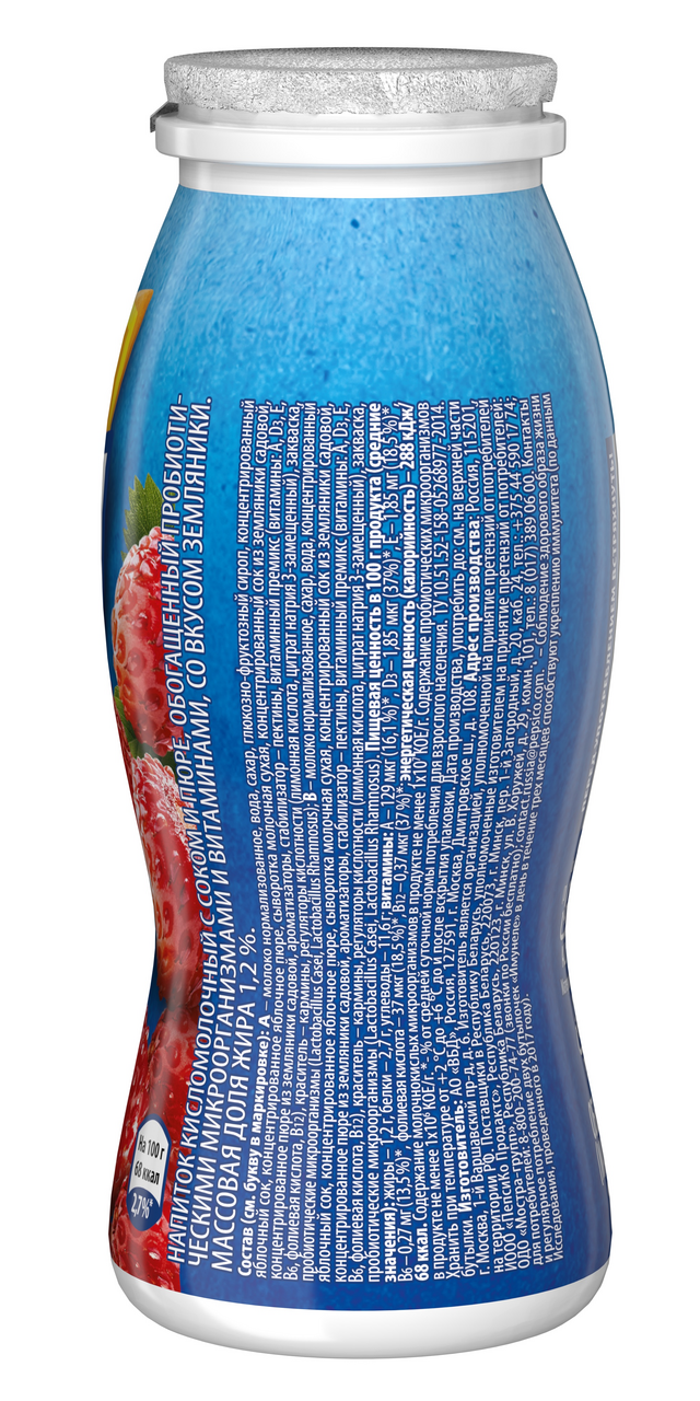 А - молоко нормализованное, сахар, вода, глюкозно-фруктозный сироп, концентрированный яблочный сок, концентрированный сок из земляники садовой, концентрированное пюре из земляники садовой, ароматизатор, стабилизатор - пектин, витаминно-минеральный премикс, краситель - кармин, регуляторы кислотности (лимонная кислота, цитрат натрия 3-замещенный), закваска, пробиотические микроорганизмы (Lactobacillus Casei, Lactobacillus Rhamnosus); В - молоко нормализованное, сахар, вода, концентрированный яблочный сок, концентрированный сок из земляники садовой, концентрированное пюре из земляники садовой, ароматизатор, стабилизатор - пектин, витаминно-минеральный премикс, краситель - кармин, регуляторы кислотности (лимонная кислота, цитрат натрия 3-замещенный), закваска, пробиотические микроорганизмы (Lactobacillus Casei, Lactobacillus Rhamnosus).