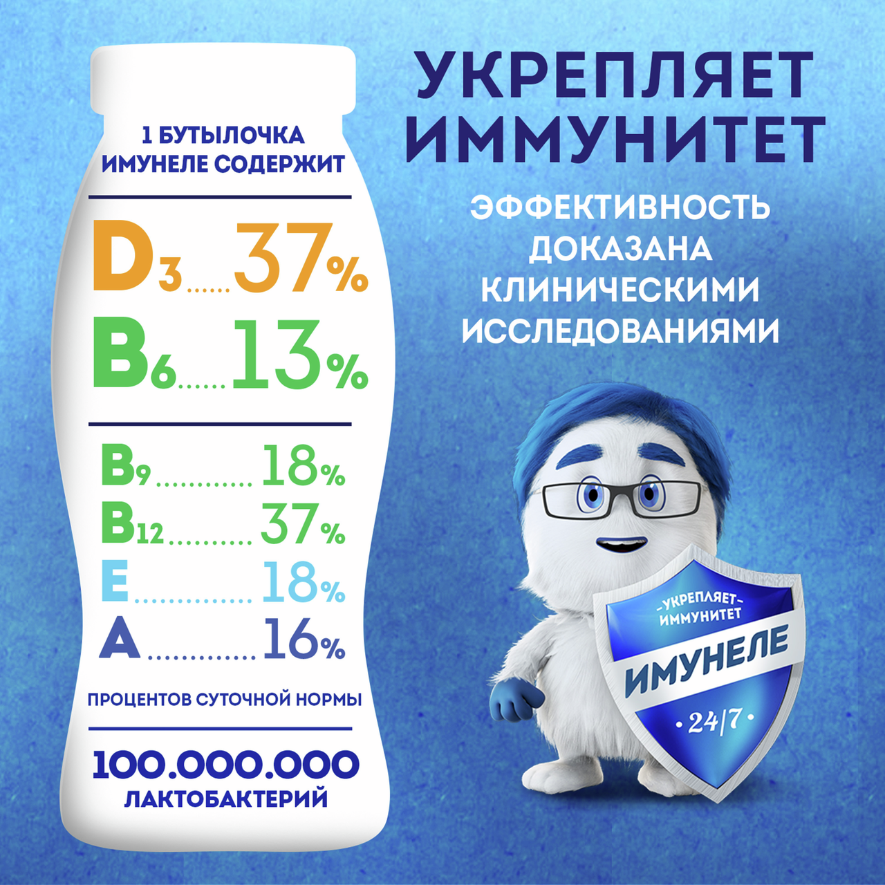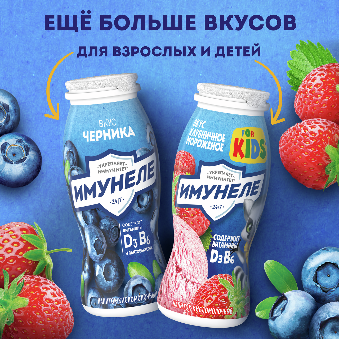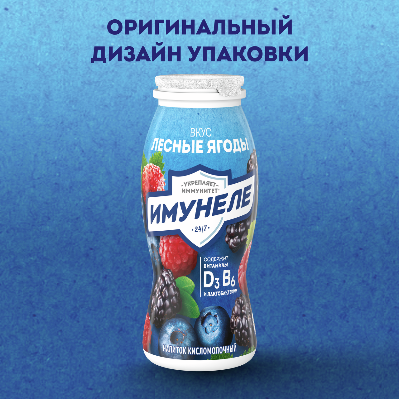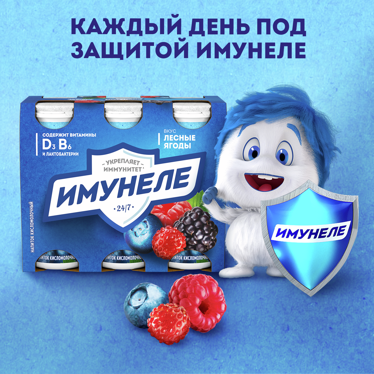 Напиток кисломолочный Имунеле Лесные ягоды 1.2% 100г. Йогурт питьевой Имунеле содержит уникальный сбалансированный комплекс полезных лактобактерий, витаминов и минералов. Пробиотик L.Casei нормализует микрофлору кишечника и защищает ее от микробов. L.Rhamnosus дополняет его действие, укрепляя иммунитет. Витамины E и D3 помогают организму сопротивляться инфекциям и препятствуют старению иммунной системы. Цинк противостоит простудам, а йод придает сил. Институт питания РАМН рекомендует Имунеле для ежедневного применения, особенно в холодное время года.