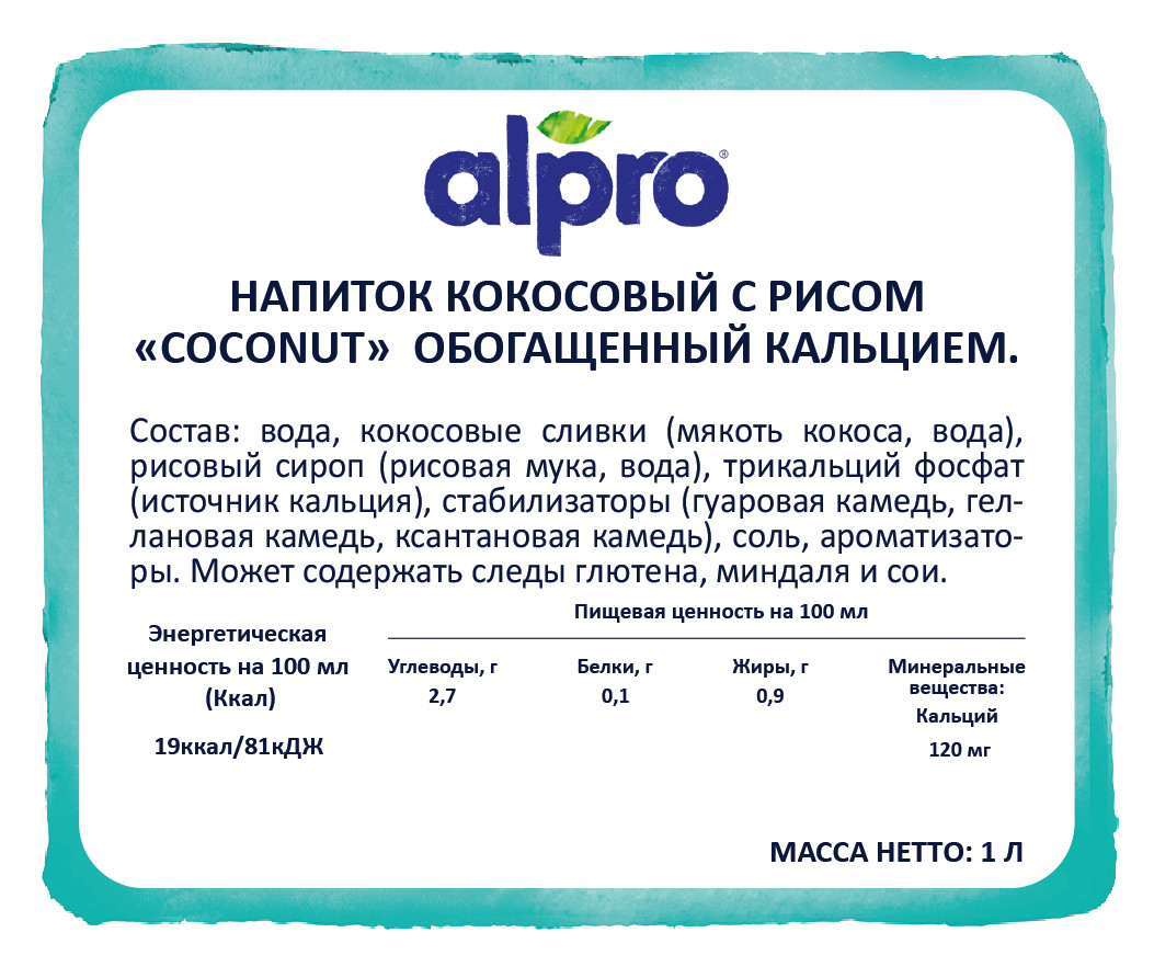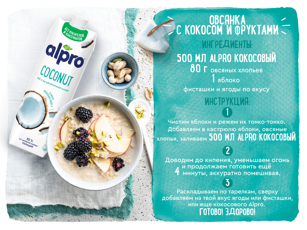 Ура! Ты делаешь правильный выбор! Попробуй кокосовый Alpro и насладись его освежающим, экзотическим вкусом и пользой. Ведь наш напиток является источником кальция. Также в кокосовом орехе содержатся пищевые волокна и минералы, полезные для твоего организма. Alpro отлично подойдет для завтрака - приготовь кашу и блинчики по-кокосовому или насладись тропическим вкусом прямо из стакана. Здорово!