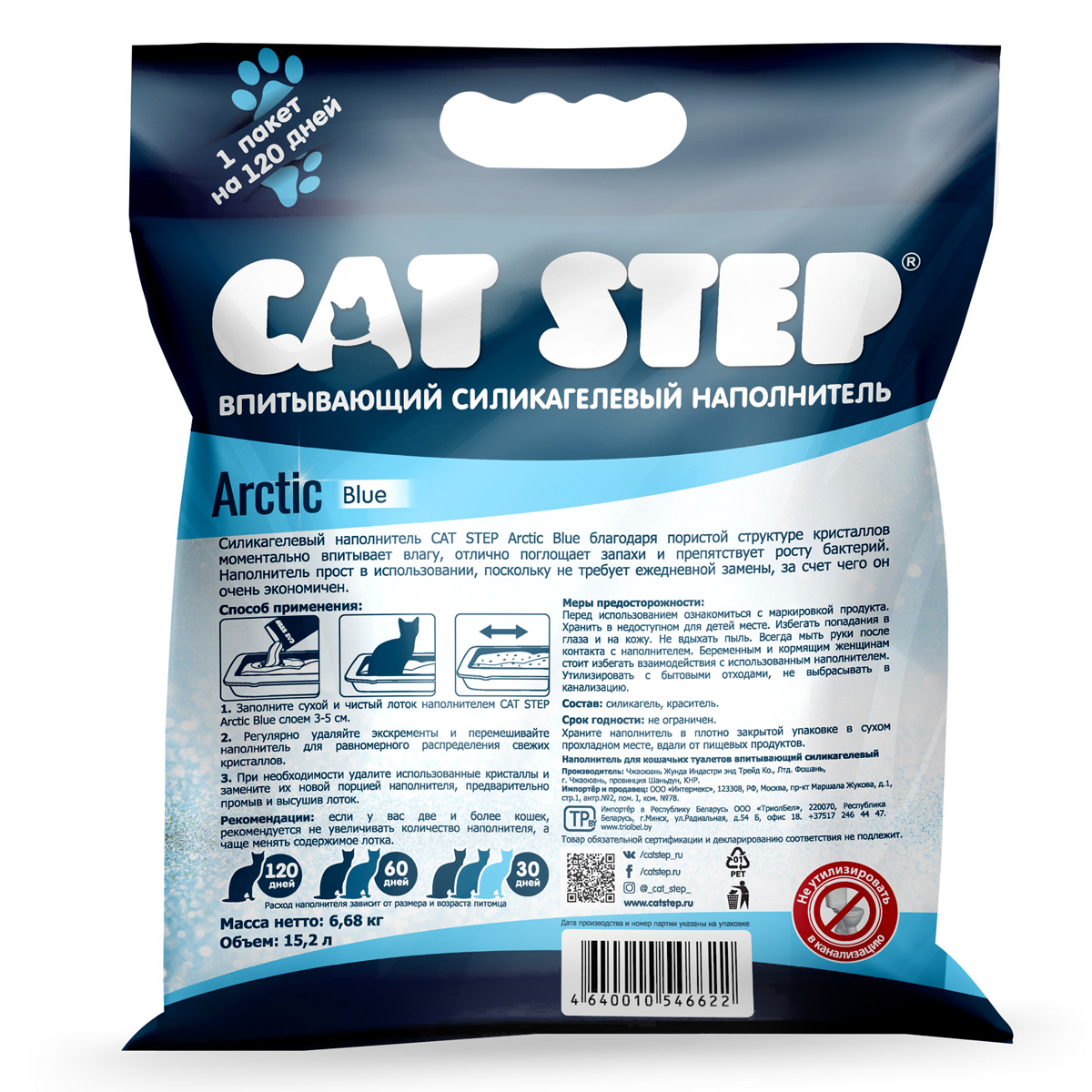 Силикагелевый наполнитель для кошачьего туалета Cat Step Arctic Blue с цветными синими гранулами моментально впитывает влагу и уничтожает запахи. Пористая структура кристаллов обеспечивает их высокую способность к поглощению жидкостей и запахов. Наполнитель препятствует размножению и развитию бактерий и грибков за счет своего неорганического происхождения. Наполнитель не требует постоянного контроля и ежедневной уборки кошачьего лотка. Содержимого пакета 15,2л хватает в среднем на 4 месяца использования. Заполните сухой и чистый лоток наполнителем Cat Step Arctic Blue слоем 3-5см. Регулярно удаляйте экскременты и перемешивайте наполнитель для равномерного распределения свежих кристаллов. Примерно через 4 недели удалите использованные гранулы и замените их новой порцией наполнителя. Не выбрасывайте использованный наполнитель в унитаз.