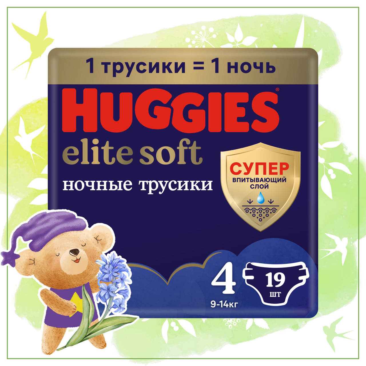 Подгузники-трусики Huggies Elite Soft ночные 4 размер 9-14кг, 19шт