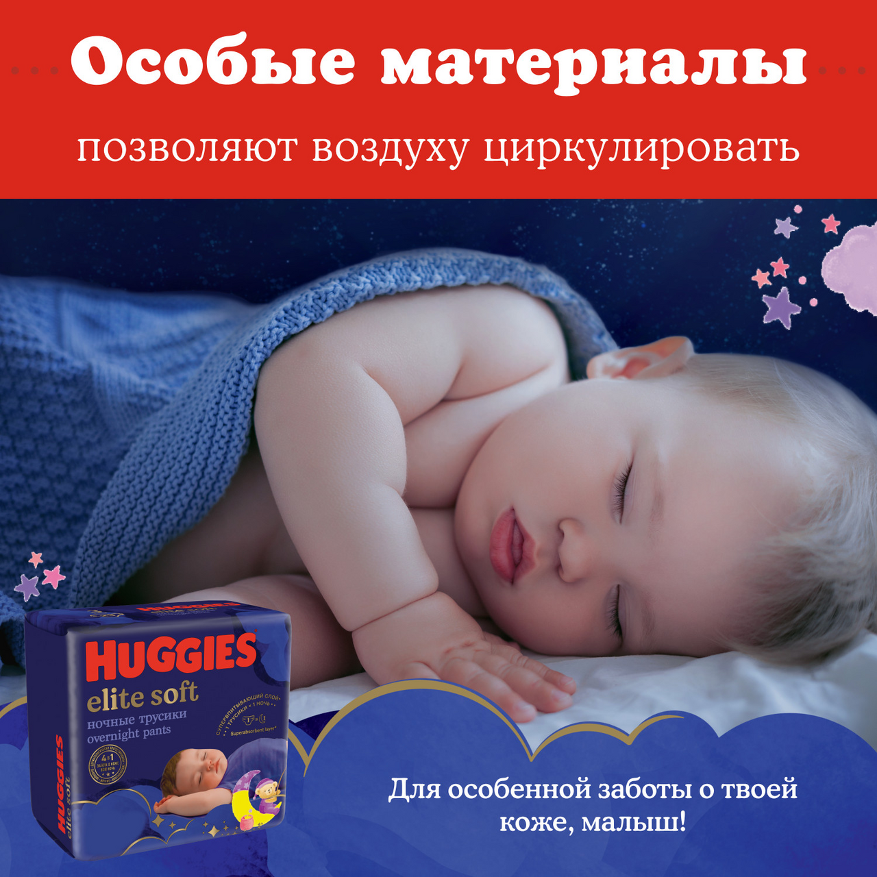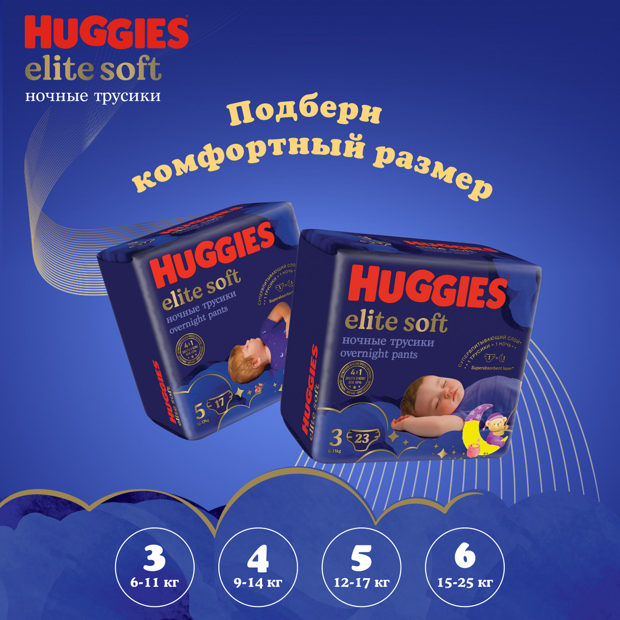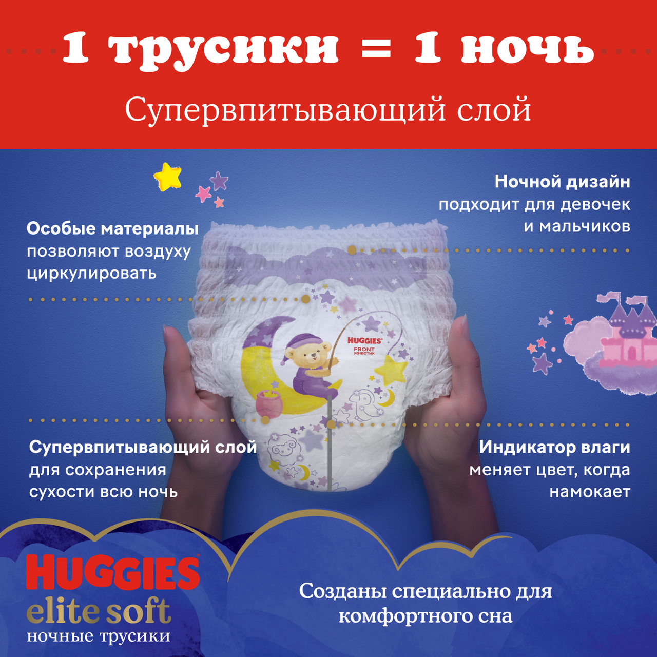 Ночные подгузники трусики Huggies Elite Soft имеют усиленный впитывающий слой, сохраняющий сухость на протяжении всей ночи. Особые материалы трусиков способствуют циркуляции воздуха, а мягкий эластичный 2-зонный цельный поясок обеспечивает комфортную посадку. Благодаря наличию усиленного впитывающего слоя* в ночных подгузниках трусиках Хаггис 4 Элит Софт кожа малыша будет надежно защищена всю ночь, а мягкие и дышащие материалы одноразового подгузника обеспечат максимальную заботу о ней — словно мамины объятия. Новые детские подгузники трусики для сна Huggies Elite Soft 4 специально созданы для заботы о коже малыша всю ночь! Усиленный впитывающий слой для сохранения сухости кожи на протяжении сна. Мягкий эластичный двухзонный цельный поясок детских подгузников создан для отличной посадки и комфорта. Липучка для удобной утилизации закрывает запах на замок. Индикатор влаги подскажет, когда придет время сменить трусики Хаггис Элит Софт. Легко надеть – просто натяните трусики, легко снять – просто разорвите боковой шов. Новый дизайн подходит для мальчиков и девочек. Huggies Elite Soft 4 размер для детей весом от 9-14 кг представлены в упаковке из 19 штук — количество для использования на протяжении нескольких ночей. *Усиленный впитывающий слой по сравнению с регулярной линейкой подгузников трусиков Huggies