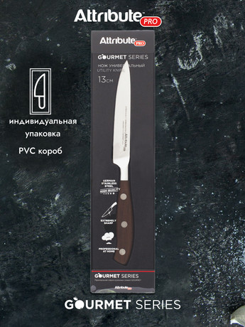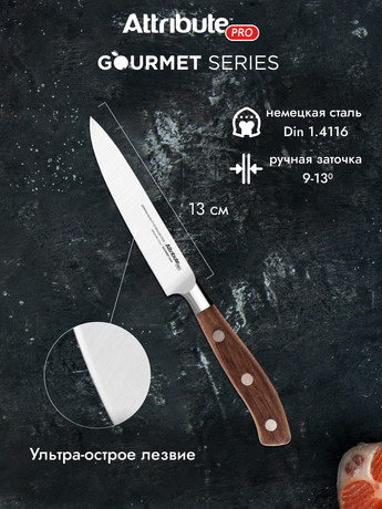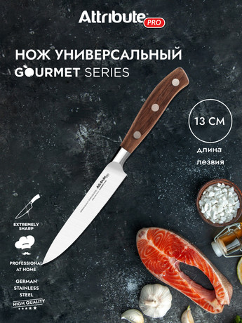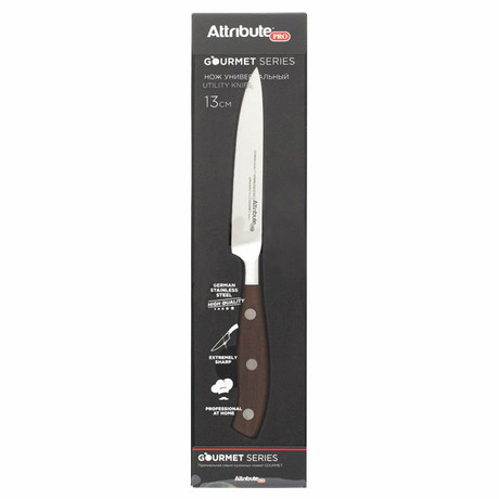 Нож Attribute Gourmet универсальный, 13 см предназначен для аккуратного и быстрого измельчения и нарезки всех видов мяса и рыбы, овощей и фруктов. Благодаря удобной рукоятке из натурального дерева, а также оптимальному соотношению длины лезвия и рукояти запястье не напрягается во время приготовления пищи. Нож выполнен из нержавеющей стали, которая характеризуется отменными антикоррозионными свойствами, механической прочностью и способностью длительное время удерживать остроту режущей кромки. Ручная заточка под углом 9-13 градусов делает нож идеально острым. Нож рекомендуется мыть вручную. После мытья вытереть сухим полотенцем. Мыть нож в посудомоечной машине нельзя. Ножи рекомендуется хранить в специальной подставке, избегая соприкосновения инструментов друг с другом.