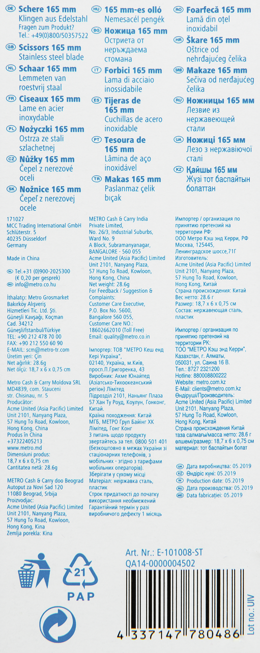 Ножницы aro 16,5 см изготовлены из высококачественной нержавеющей стали. Острые лезвия заточены по уникальной технологии. Благодаря эргономичной пластиковой ручке ножницы удобны в применении и отлично лежат в руке. Благодаря высокому качеству сборки даже после многолетнего использования они не подвергаются поломке. Ножницы могут активно применяться как в офисах, так и дома. Оптимальная длина составляет 16,5 см и позволяет использовать канцелярскую принадлежность для различного вида работ.