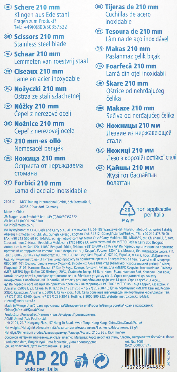 Ножницы aro длиной 210 мм пригодятся в быту, в офисе или в школе. Изделие изготовлено из нержавеющей стали высокого качества, оснащены ручками эргономичной формы. Материалы прочные и износоустойчивые, мало подвержены деформации, истиранию, появлению сколов и трещин. Модель долгое время сохраняет первоначальный внешний вид и заточку.