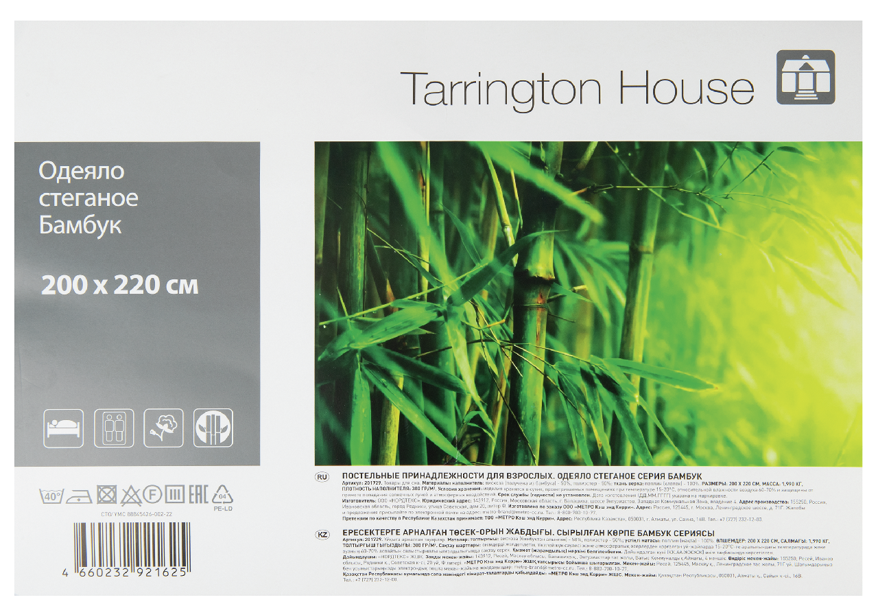 Tarrington House Одеяло полиэстер 100% серия бамбук, 200 x 220 см — это отличный вариант для тех, кто хочет оставаться в тепле даже самой холодной зимой, при этом позволяя телу дышать. Одеяло очень приятное в тактильном плане, отличается мягкостью и очень высоким качеством. С ним станет гораздо уютнее. А благодаря оптимальным размерам укрываться можно как одному, так и вместе со своим партнером. Основные преимущества: — 100% бамбук. Одеяло изготовлено из очень долговечного и качественного материала, поэтому оно наверняка прослужит много лет. С ним будет тепло зимой и максимально комфортно в теплое время года. При этом кожа не будет преть, так как материал пропускает воздух. — Оптимальный размер. Длина и ширина одеяла составляет 200 x 220 сантиметров, поэтому его может использовать как один человек, так и пара. Это оптимальный вариант даже для полуторной или двуспальной кровати. — Минимальный вес. Одеяло само по себе очень легкое, его масса почти не ощущается. В случае необходимости его возможно свернуть и без каких-либо трудностей транспортировать. — Уход. В случае необходимости одеяло можно просто постирать в стиральной машинке. Оно будет всегда оставаться чистым и свежим, сохраняя приятный запах. Tarrington House Одеяло серия бамбук — оптимальное решение для тех, кто хочет ощущать тепло и уют в любое время года. Одеяло отличается высоким качеством, функциональностью и стильным внешним видом.