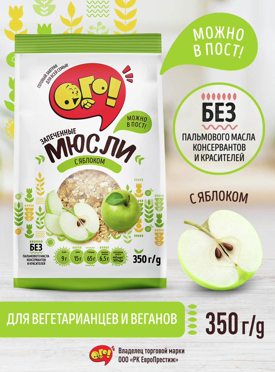 Хлопья овсяные, хлопья пшеничные, рапсовое масло, сахар, изюм, вода питьевая, рис экструдированный (крупа рисовая, соль), кусочки сушеного яблока в рисовой муке, ядра семян подсолнечника, мука пшеничная хлебопекарная, патока, соль.