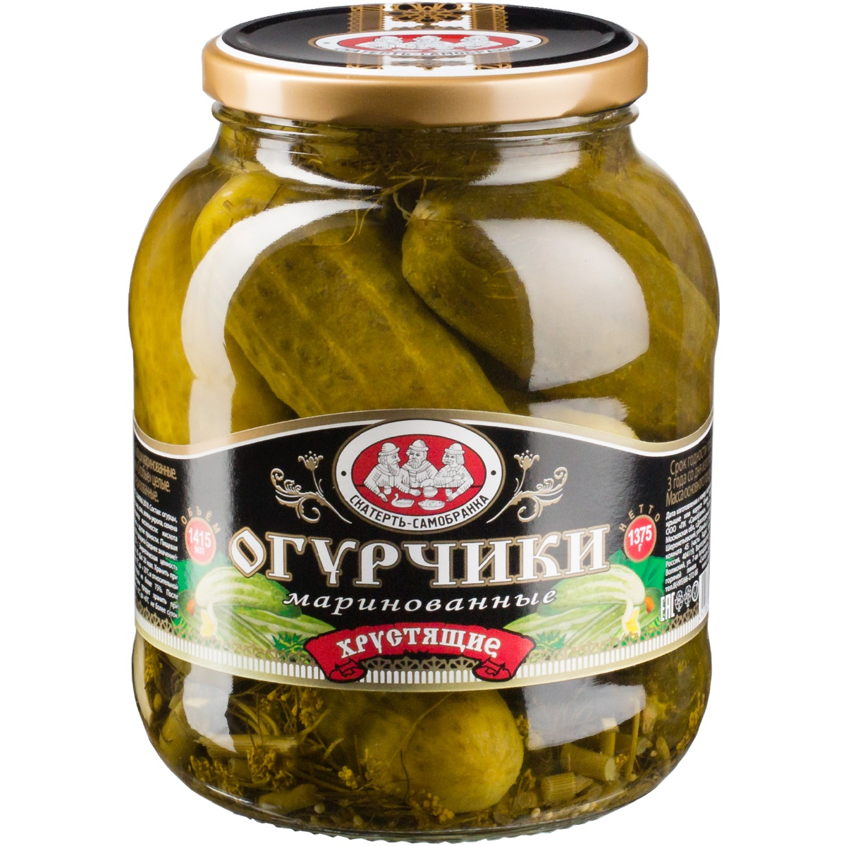 Сложно представить себе традиционное русское застолье без маринованных огурцов. Огурцы маринованные Скатерть-Самобранка, 1,415 л станут прекрасным дополнением стола. Они идеально подойдут как в качестве самостоятельной закуски, так и при использовании их в различных блюдах. Отборные хрустящие огурцы, приготовленные по традиционному рецепту, порадуют вас изумительным вкусом. Умеренный кисло-сладкий маринад, сдобренный зернами горчицы, добавляет огурцам дополнительную легкую пикантность. Маринованные огурцы не утрачивают полностью своих полезных свойств: они содержат сложные органические вещества, а также витамины С, В1,В2, В5, В6, РР, Е и провитамин А.