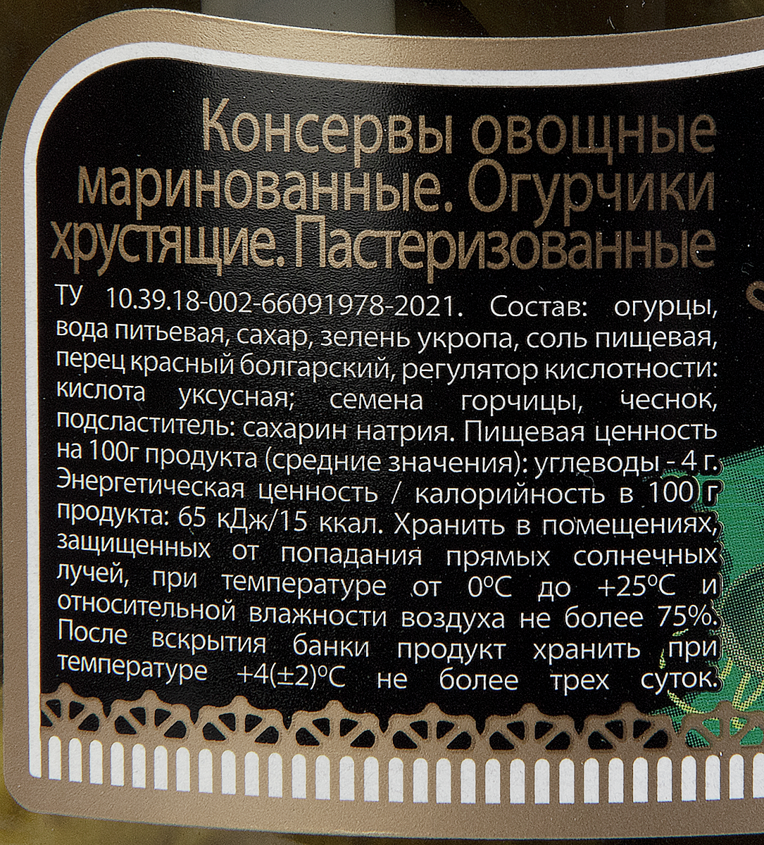 Огурцы (до 9 см), вода, уксус, соль, сахар, укроп, желтая горчица, лук, черный перец, хлорид кальция.