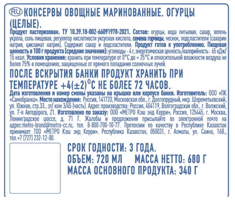 Огурцы, вода, сахар, свежий укроп, соль, регулятор кислотности: кислота уксусная, семена горчицы, чеснок.
