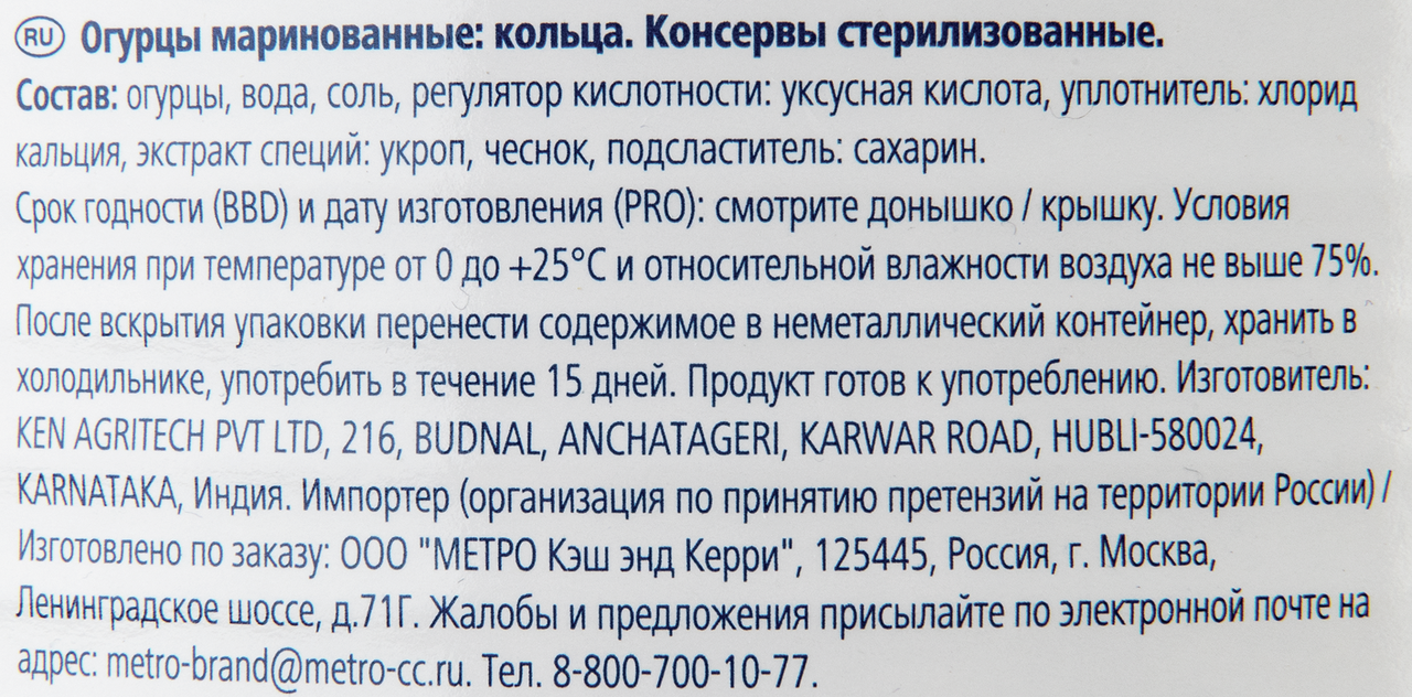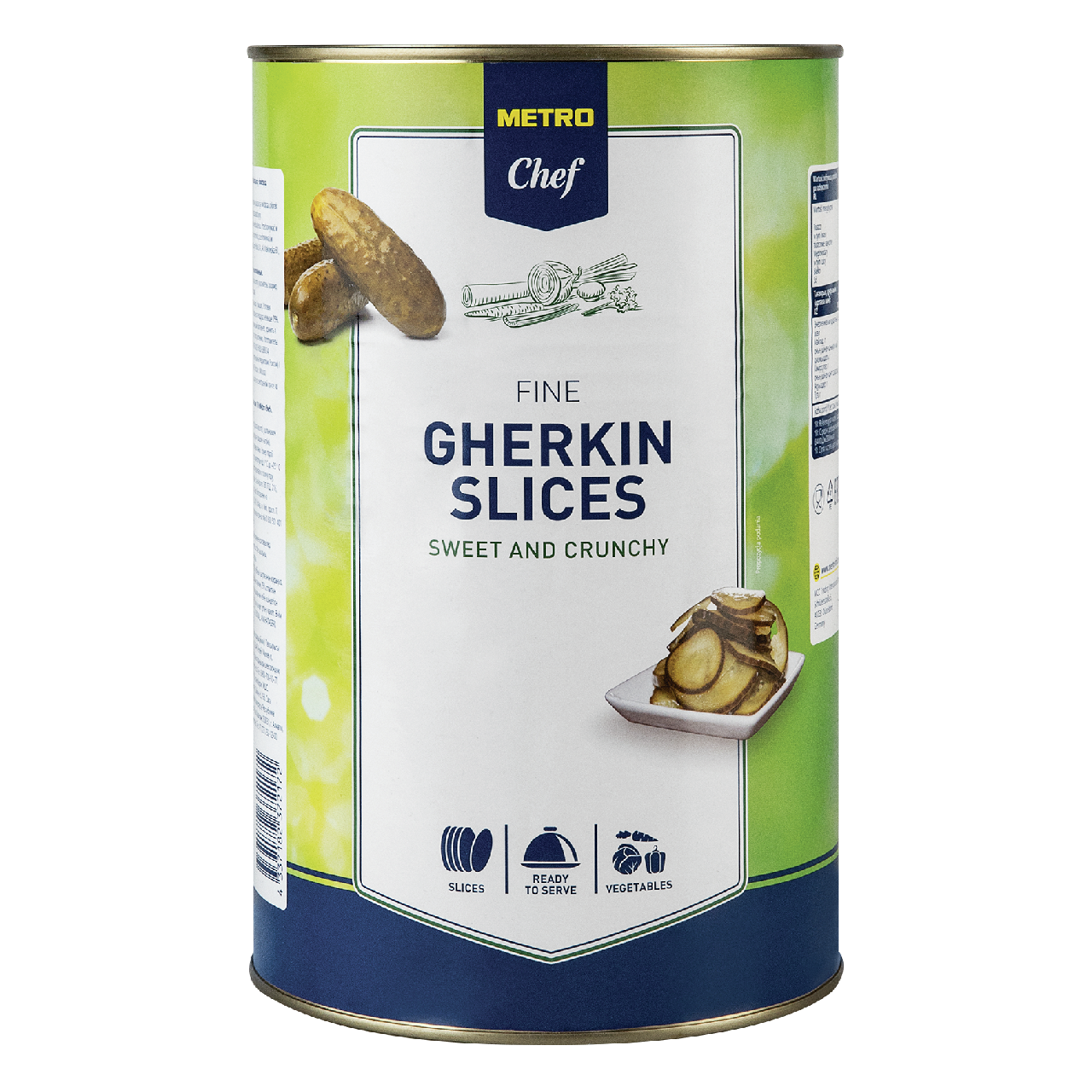 METRO Chef Огурцы маринованные резаные, 4.1кг вкусные однокомпонентные овощные консервы. В состав экологичного продукта входят вода, соль, уксусная кислота, регулирующая кислотность, и пряности в виде укропа, чеснока, однако отсутствует ГМО. В маринованных огурцах содержатся соединения йода, предотвращающие возникновение заболеваний щитовидной железы, сосудов, благотворно влияющие на работу пищеварительного тракта, снижающие уровень холестерина в крови. Маринованные овощи хорошо возбуждают аппетит, считаются естественными антиоксидантами. В кулинарии они используются в виде самостоятельной закуски, отлично сочетаются с рыбными блюдам, жареным мясом, отварными или тушеными овощами, гарнирами, супами и соусами. Огурцы добавляют в рассольник, оливье, бутерброды, тарталетки и другие закуски.