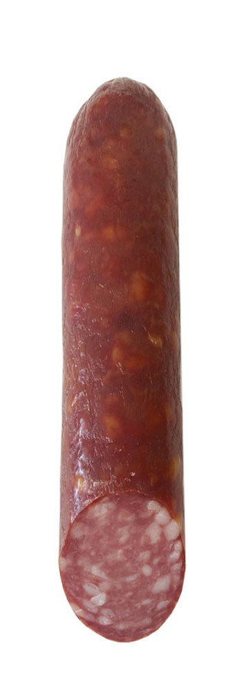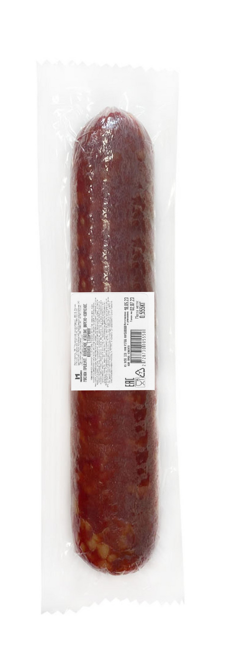 Шпик, свинина, грудка куриная, соевый белок, смесь посолочно-нитритная (соль, фиксатор окраски: нитрит натрия), пшеничное волокно, мальтодекстрин, соль, усилитель вкуса и аромата (глутамат натрия), дрожжевой экстракт, уплотнитель (хлорид кальция), глюкоза, специи и экстракты специй (чеснок, перец черный, перец душистый), антиокислители (аскорбиновая кислота, аскорбат натрия), декстроза, гемоглобин, краситель (кармины), ароматизаторы, стартовая культура.