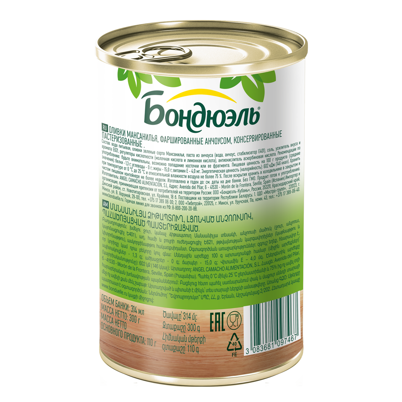 Вода, оливки зеленые сорта Мансанилья, паста из анчоуса (вода, анчоус, стабилизатор Е401), соль, усилитель вкуса и аромата Е621, регуляторы кислотности (молочная кислота и лимонная кислота), антиокислитель аскорбиновая кислота.