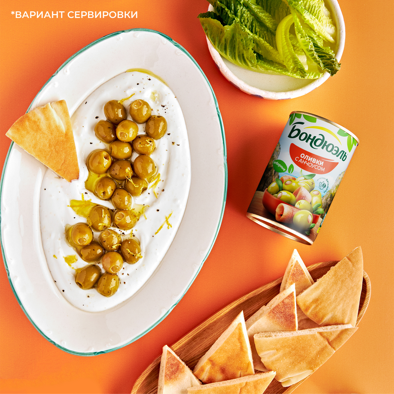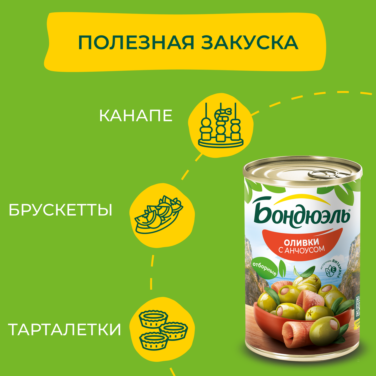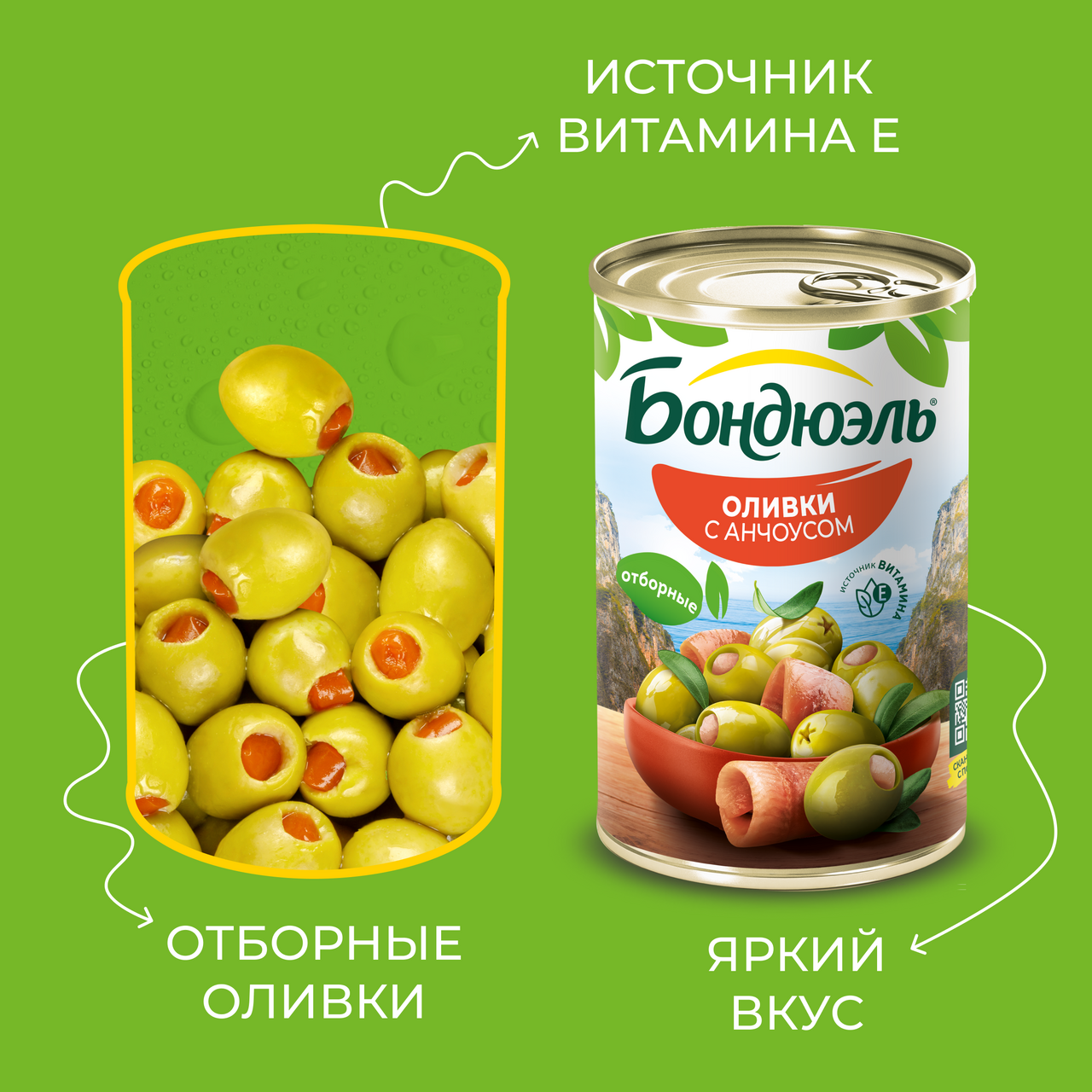 Новинка Бондюэль - оливки, фаршированные анчоусами, - кулинарная магия Средиземноморья. Вот наш рецепт колдовства. Оливки, выращенные в испанском регионе Андалусия, крупные, сочные и нежные. Анчоусы - изящная рыбка, соленая, как море, пикантная и слегка пряная. Мы положили кусочки этой маленькой рыбки в оливки - их союз бесподобен. Украсьте ими пиццу, добавьте в пасту или в салат. Да просто подавайте как самостоятельную закуску.
