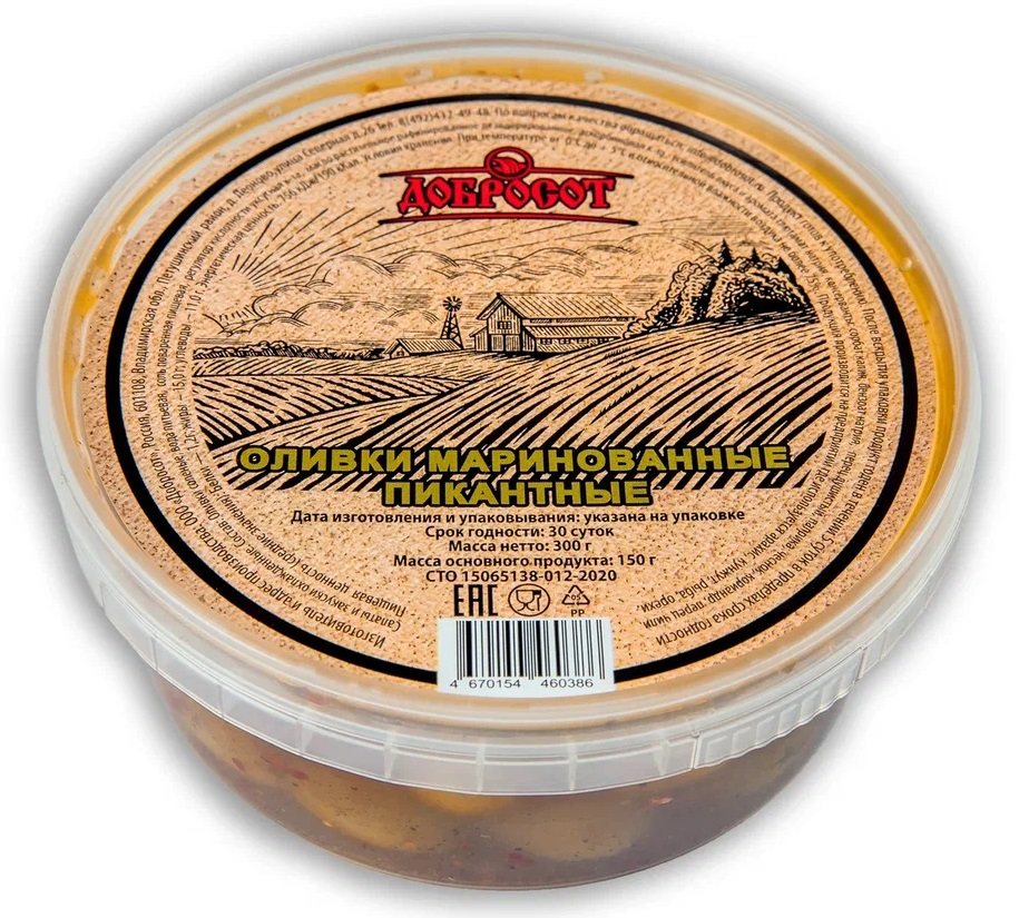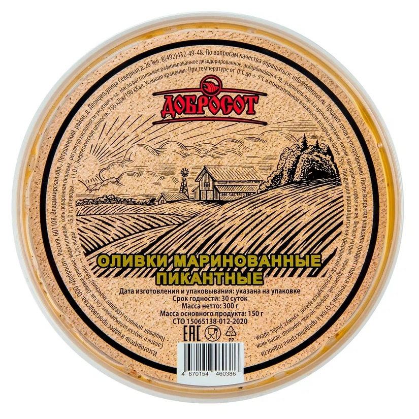 Оливки соленые, вода питьевая, соль поваренная пищевая, регулятор кислотности уксусная кислота, масло растительное рафинированное дезодорированное, аскорбиновая кислота, усилитель вкуса и аромата глутамат натрия, консерванты: сорбат калия, бензоат натрия, перец душистый, паприка, чеснок, кориандр, перец чили.