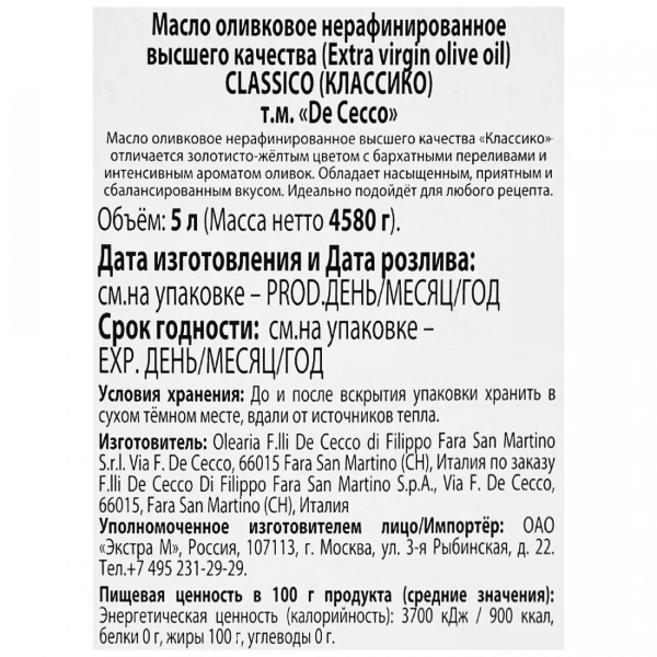 Масло оливковое De Cecco Extra Virgin нерафинированное, 5л