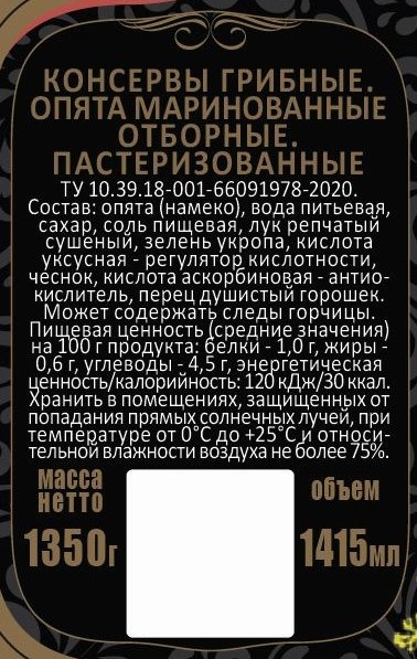 Выразительный натуральный насыщенный аромат, свойственный маринованным опятам, хорошо подчеркнут букетом специй, в котором различимы тона чеснока и зелени укропа. Прекрасная закуска, которая украсит и торжественный обед в кругу семьи, и официальный банкет.