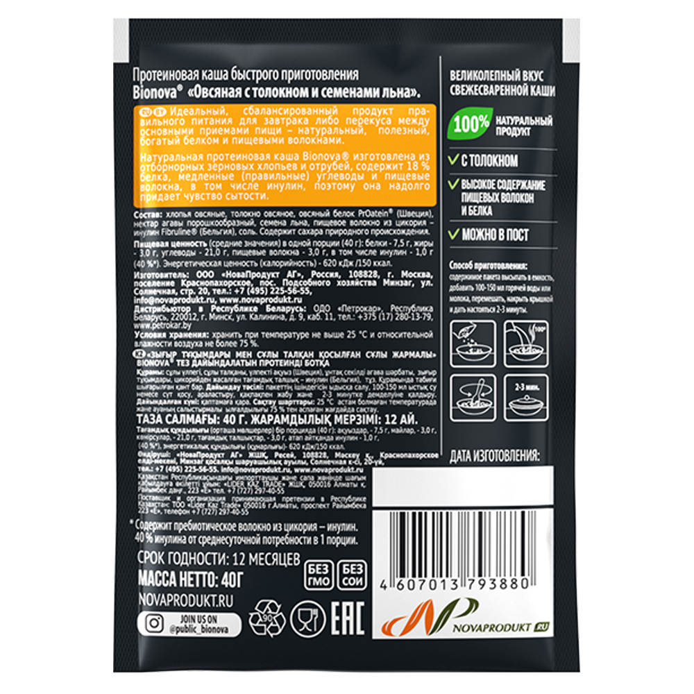 Каша Bionova овсяная протеиновая с толокном и льном, 40г