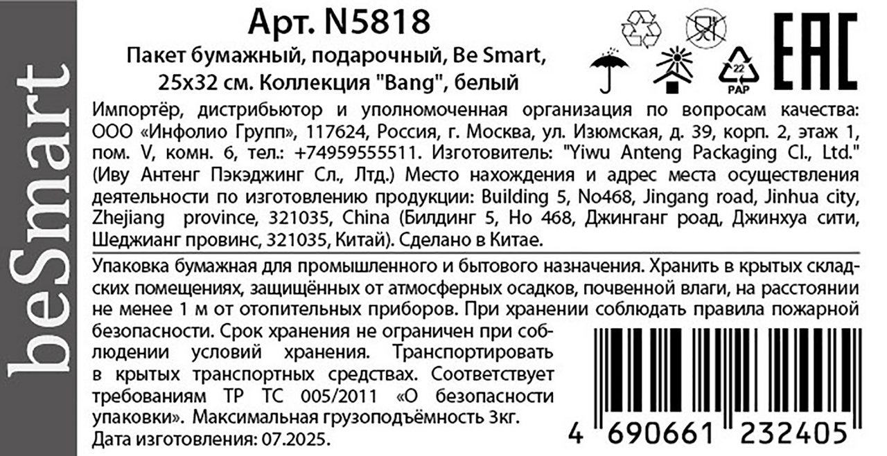 Пакет подарочный Be Smart Universal, 25 x 32см