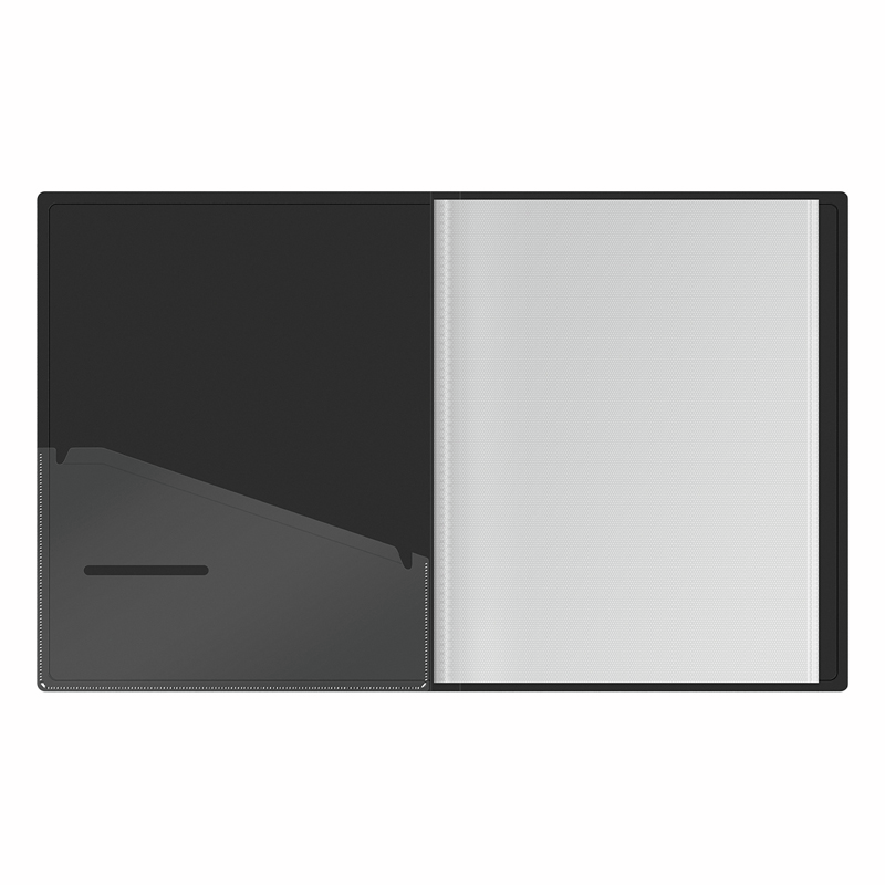 Отличный и стильный помощник для хранения документов черного цвета с рельефным рисунком UV-лаком. Папка изготовлена из высококачественного полипропилена с матовой текстурой поверхности "песок", на которой не видно отпечатков пальцев и мелких царапин. Внутренняя сторона обложки имеет чёрный цвет и оснащена плотным прозрачным карманом для удобного хранения мелочей: ручки, заметок, визиток, дисков, флешек.