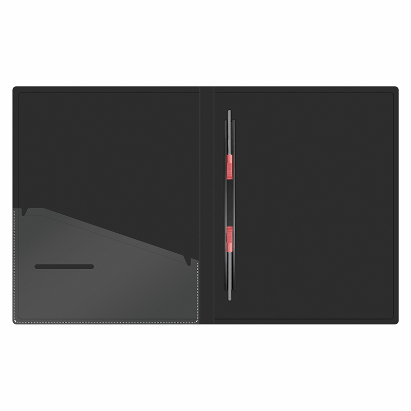 Станет функциональным помощником для хранения документов с обложкой черного цвета с рельефным рисунком UV-лаком. Папка изготовлена из высококачественного полипропилена толщиной 0,6 мм с матовой текстурой поверхности "песок", на которой не видно отпечатков пальцев и мелких царапин. Внутренняя поверхность папки имеет чёрный цвет, а скоросшиватель выполнен в чёрно-красном цвете. На внутренней стороне папки присутствует дополнительный прозрачный пластиковый карман для хранения мелочей: ручки, заметок, визиток, дисков, флешек и др.