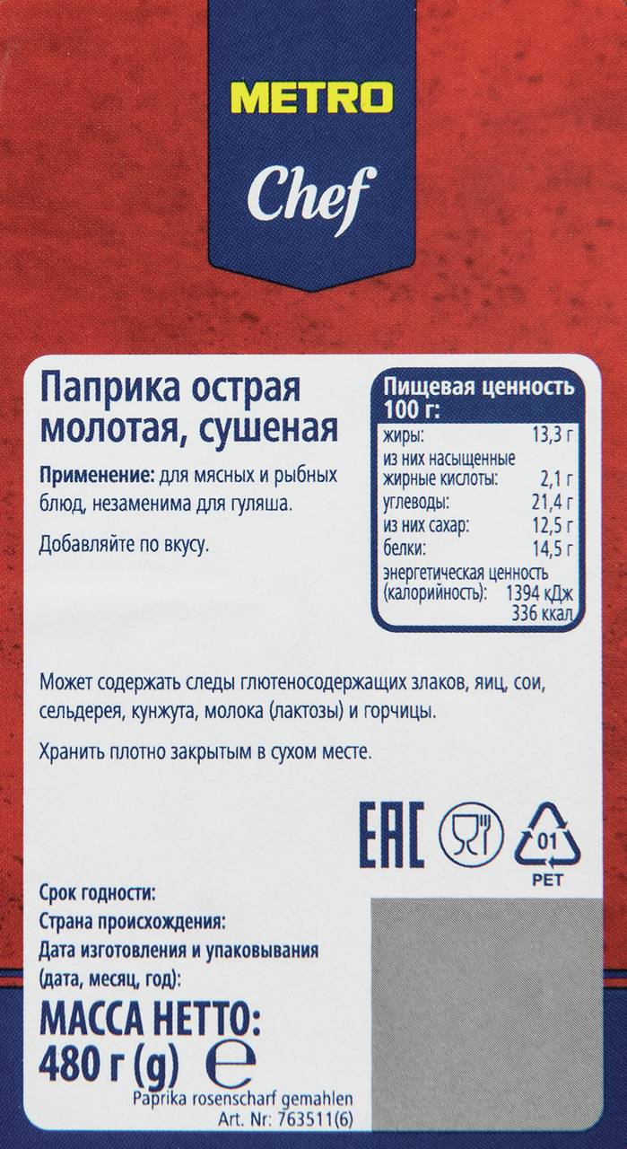 Паприка METRO Chef молотая острая, 480 г – это острая и ароматная приправа, которая нашла самое широкое применение в кулинарии. Тонкий аромат паприки дополнит остротой любые блюда. Особенно хорошо она сочетается с жареным мясом. Тушеные блюда также только выиграют если использовать такую приправу во время приготовления (например, традиционный венгерский гуляш приобретает более насыщенный и яркий вкус). Паприка отлично подходит к отварному или жареному картофелю, ее можно добавить маринад для запекания мяса. Стоит учесть, что при слишком длительном и сильном нагреве среднеострая паприка несколько меняет свой вкус и начинает горчить. Поэтому не стоит ее обжаривать в кипящем масле, лучше добавлять в почти готовые блюда или использовать в качестве ингредиента в соусах и маринадах.