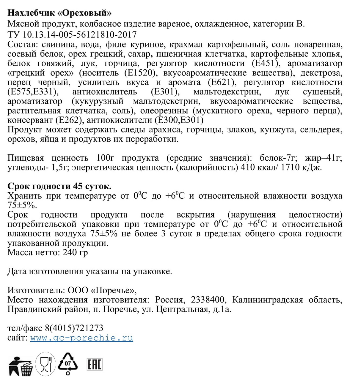 Свинина, вода, филе куриное, крахмал картофельный, соль поваренная, соевый белок, орех грецкий, сахар, пшеничная клетчатка, картофельные хлопья, белок говяжий, лук, горчица, регулятор кислотности (E451), ароматизатор грецкий орех (носитель (E1520), вкусоароматические вещества), декстроза, перец черный, усилитель вкуса и аромата (E621), регулятор кислотности (E575,E331), антиокислитель (E301), мальтодекстрин, ароматизатор (кукурузный мальтодекстрин, вкусоароматические вещества, растительная клетчатка, соль), олеорезины (мускатного ореха, черного перца), консервант (Е262), антиокислители (E300,E301).