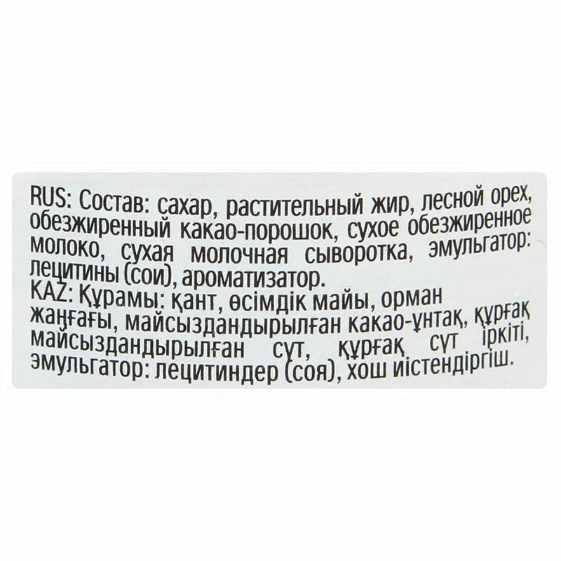 Сахар 55 %, модифицированное пальмовое масло 23 %, лесной орех 13 %, обезжиренное какао 4 %, обезжиренное сухое молоко 5 %, лактоза, сухая сыворотка, эмульгатор (соевый лецитин), ароматизатор идентичный натуральному (ванилин).