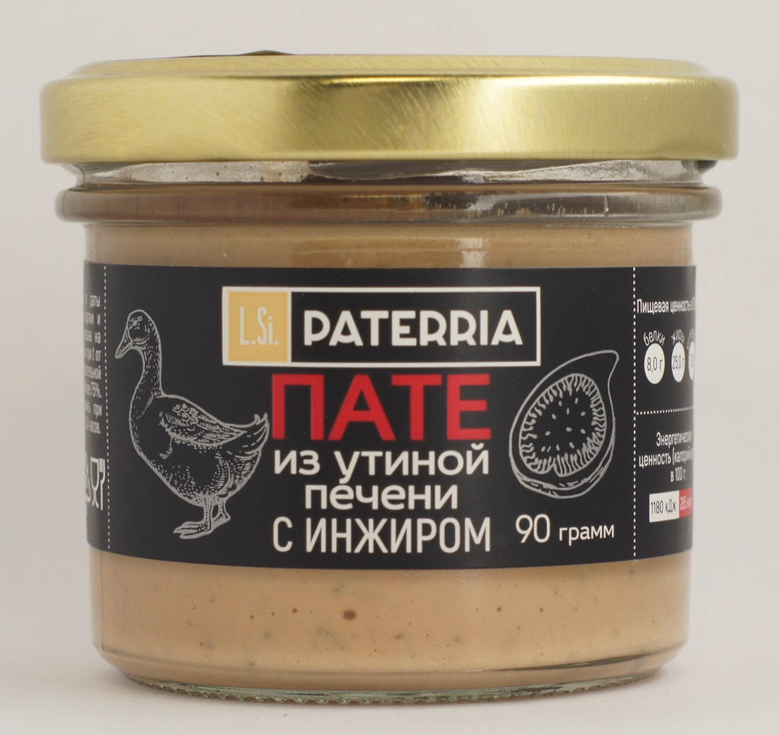 Пате из утиной печени с инжиром выпускается под брендом Paterria и имеет выраженный вкус, который достигается за счет применения натуральных ингредиентов и качественных компонентов. Среди них следует выделить инжир, томленый в белом вине, а также чеснок и тимьян. На продолжительный срок хранения влияют влагоудерживающие пищевые добавки. Продукт помещается в эргономичную стеклянную упаковку, которая после открытия крышки может использоваться повторно.