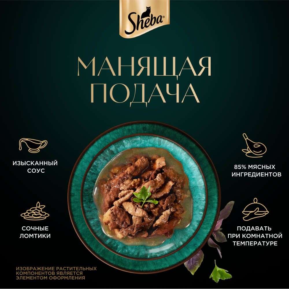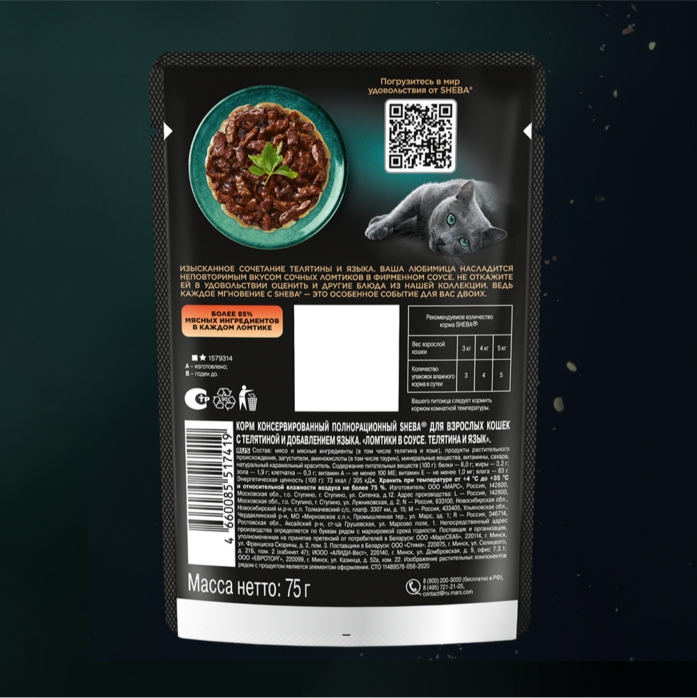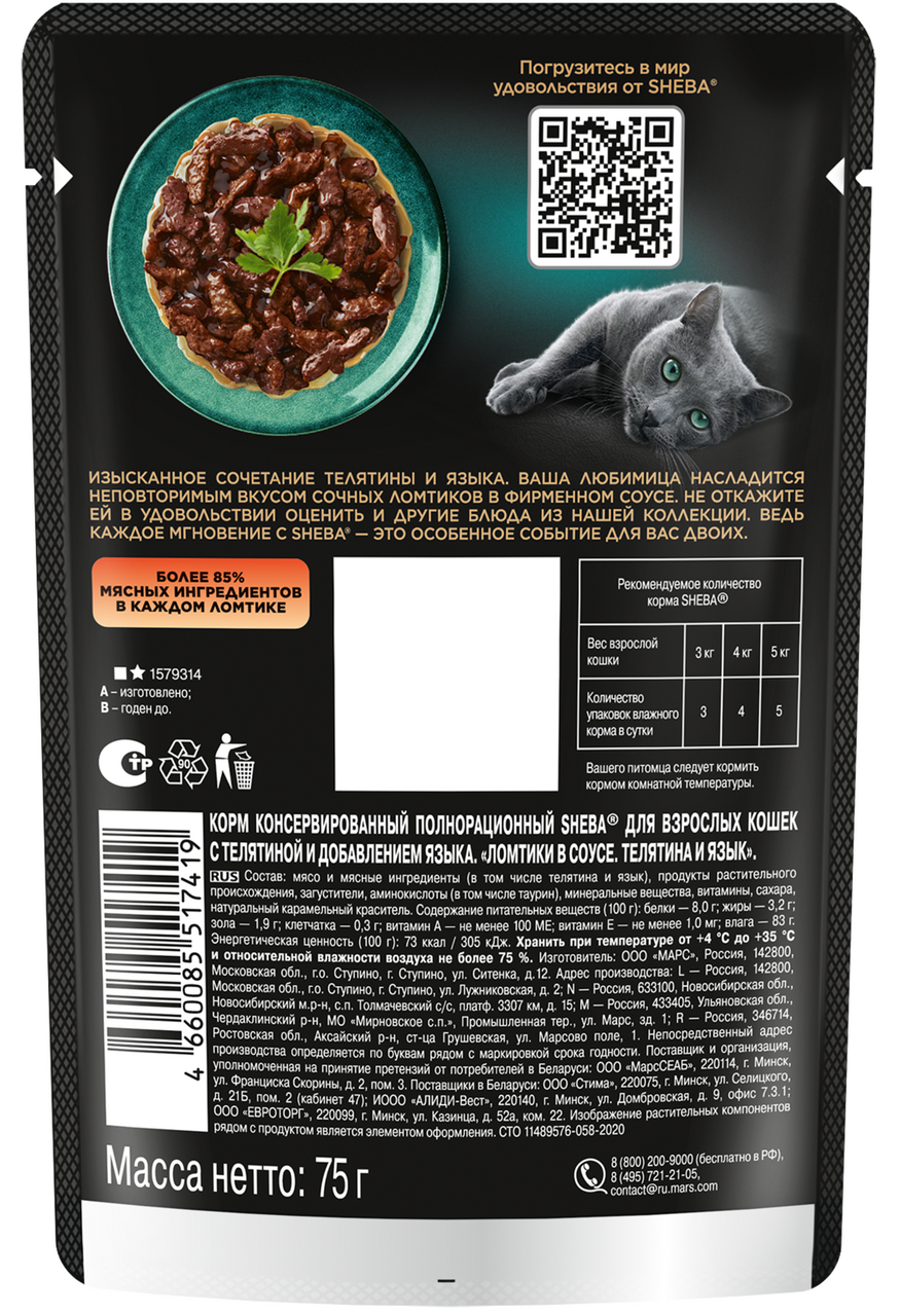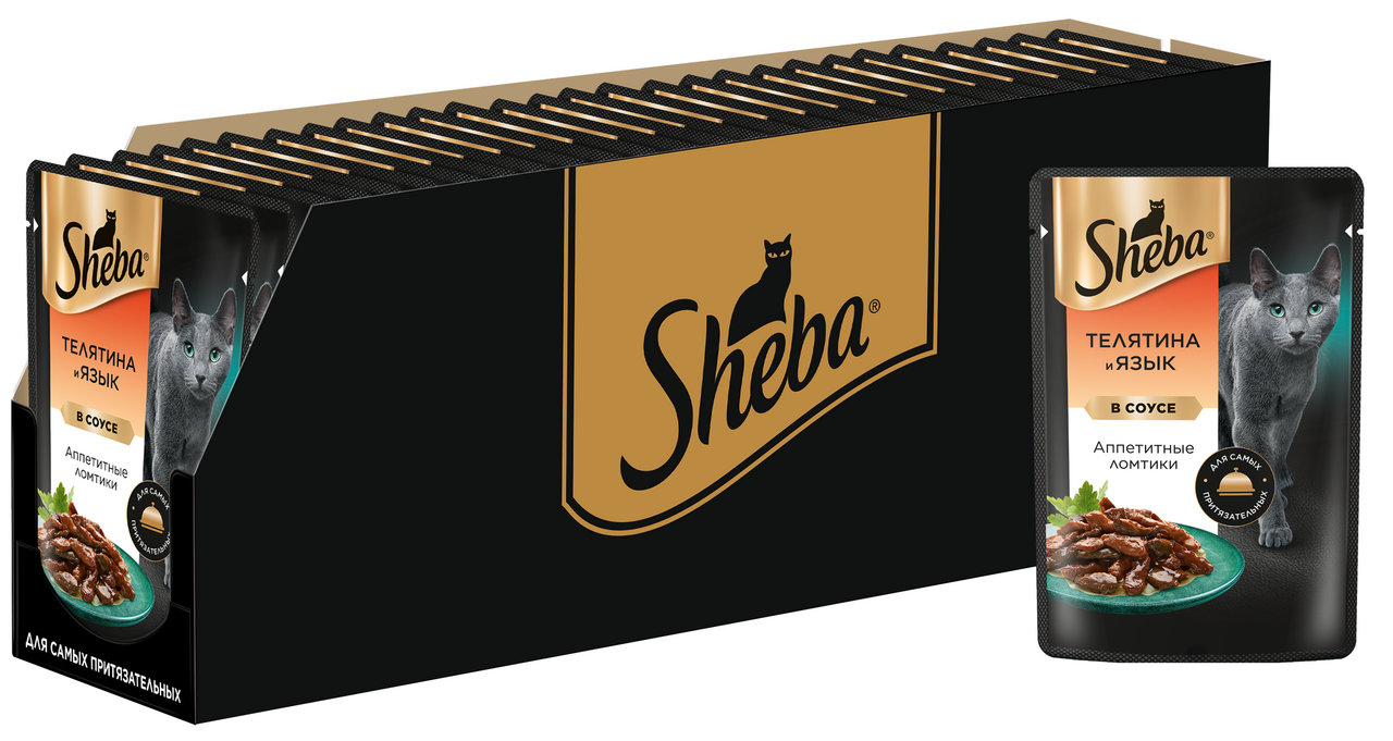 Ломтики с сочной телятиной и нежным языком в фирменном соусе - блюдо из высококачественных ингредиентов, которое придётся по вкусу самым притязательным кошкам. Мы приготовили его по особому рецепту, чтобы раскрыть всю красоту вкуса и сохранить баланс витаминов, минералов и аминокислот, необходимых вашей любимице. Подарите своей кошке особое удовольствие, побаловав ее всеми блюдами из коллекции Sheba.