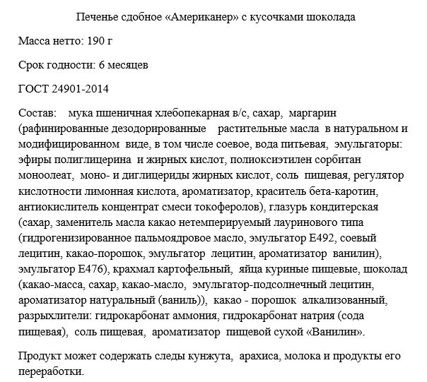 Мука пшеничная хлебопекарная высшего сорта, сахар, маргарин (рафинированные дезодорированные растительные масла в натуральном и модифицированном виде, в том числе соевое, вода питьевая, эмульгаторы: эфиры полиглицерина и жирных кислот, полиоксиэтилен сорбитан моноолеат, моно - и диглицериды жирных кислот, соль пищевая, регулятор кислотности лимонная кислота, ароматизатор, краситель бета-каротин, антиокислитель концентрат смеси токоферолов), глазурь кондитерская (сахар, заменитель масла какао нетемперируемый лауринового типа (гидрогенизированное пальмоядровое масло, эмульгатор Е492, соевый лецитин, какао-порошок, эмульгатор лецитин, ароматизатор ванилин), эмульгатор Е476), крахмал картофельный, яйца куриные пищевые, шоколад (какао-масса, сахар, какао-масло, эмульгатор-подсолнечный лецитин, ароматизатор натуральный (ваниль)), какао - порошок алкализованный, разрыхлители: гидрокарбонат аммония, гидрокарбонат натрия (сода пищевая), соль пищевая, ароматизатор пищевой сухой Ванилин.