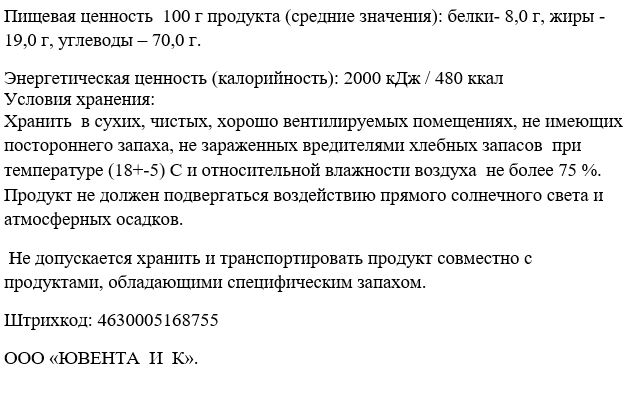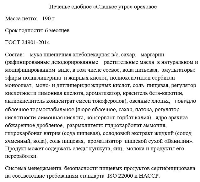 Мука пшеничная хлебопекарная высшего сорта, сахар, маргарин (рафинированные дезодорированные растительные масла в натуральном и модифицированном виде, в том числе соевое, вода питьевая, эмульгаторы: эфиры полиглицерина и жирных кислот, полиоксиэтилен сорбитан моноолеат, моно - и диглицериды жирных кислот, соль пищевая, регулятор кислотности лимонная кислота, ароматизатор, краситель бета-каротин, антиокислитель концентрат смеси токоферолов), овсяные хлопья, повидло яблочное термостабильное (пюре яблочное, сахар, патока, регулятор кислотности-лимонная кислота, консервант-сорбат калия), ядро арахиса обжаренное дроблёное, разрыхлители: гидрокарбонат аммония, гидрокарбонат натрия (сода пищевая), солодовый экстракт жидкий (солод ячменный, вода), соль пищевая, ароматизатор пищевой сухой Ванилин.